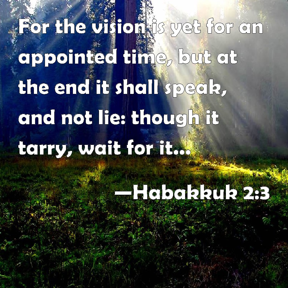 Choose a Background Habakkuk 2:3 For the vision is yet for an appointed time, but at the end it shall speak, and not lie: though it tarry, wait for it; because it will surely come, it will not tarry. KJV: For the vision is yet for an appointed time, but at the end it shall speak, and not lie: though it tarry, wait for it; because it will surely come, it will not tarry. DRB: For as yet the vision is far off, and it shall appear at the end, and shall not lie: if it make any delay, wait for it: for it shall surely come, and it shall not be slack. DBT: For the vision is yet for an appointed time, but it hasteth to the end, and shall not lie: though it tarry, wait for it; for it will surely come, it will not delay. ERV: For the vision is yet for the appointed time, and it hasteth toward the end, and shall not lie: though it tarry, wait for it; because it will surely come, it will not delay. WBT: For the vision is yet for an appointed time, but at the end it shall speak, and not lie: though it may tarry, wait for it; because it will surely come, it will not tarry. WEB: For the vision is yet for the appointed time, and it hurries toward the end, and won't prove false. Though it takes time, wait for it; because it will surely come. It won't delay. YLT: For yet the vision is for a season, And it breatheth for the end, and doth not lie, If it tarry, wait for it, For surely it cometh, it is not late.Links Habakkuk 2:3 NIV • Habakkuk 2:3 NLT • Habakkuk 2:3 ESV • Habakkuk 2:3 NASB • Habakkuk 2:3 KJV • Habakkuk 2:3 Interlinear • Habakkuk 2:3 Commentaries • Habakkuk 2:3 Parallel Texts • Habakkuk 2:3 Bible Apps • Habakkuk 2:3 Parallel • Bible Hub |