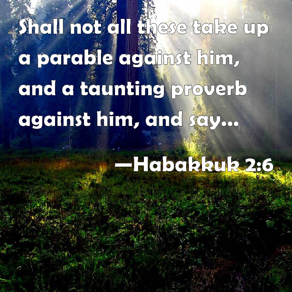 Choose a Background Habakkuk 2:6 Shall not all these take up a parable against him, and a taunting proverb against him, and say, Woe to him that increases that which is not his! how long? and to him that lades himself with thick clay! KJV: Shall not all these take up a parable against him, and a taunting proverb against him, and say, Woe to him that increaseth that which is not his! how long? and to him that ladeth himself with thick clay! DRB: Shall not all these take up a parable against him, and a dark speech concerning him: and it shall be said: Woe to him that heapeth together that which is not his own? how long also doth he load himself with thick clay? DBT: Shall not all these take up a proverb about him, and a taunting riddle against him, and say, Woe to him that increaseth that which is not his! how long? and to him that loadeth himself with pledges! ERV: Shall not all these take up a parable against him, and a taunting proverb against him, and say, Woe to him that increaseth that which is not his! how long? and that ladeth himself with pledges! WBT: Shall not all these take up a parable against him, and a taunting proverb against him, and say, Woe to him that increaseth that which is not his! how long? and to him that ladeth himself with thick clay! WEB: Won't all these take up a parable against him, and a taunting proverb against him, and say, 'Woe to him who increases that which is not his, and who enriches himself by extortion! How long?' YLT: Do not these — all of them — against him a simile taken up, And a moral of acute sayings for him, And say, Woe to him who is multiplying what is not his? Till when also is he multiplying to himself heavy pledges?Links Habakkuk 2:6 NIV • Habakkuk 2:6 NLT • Habakkuk 2:6 ESV • Habakkuk 2:6 NASB • Habakkuk 2:6 KJV • Habakkuk 2:6 Interlinear • Habakkuk 2:6 Commentaries • Habakkuk 2:6 Parallel Texts • Habakkuk 2:6 Bible Apps • Habakkuk 2:6 Parallel • Bible Hub |