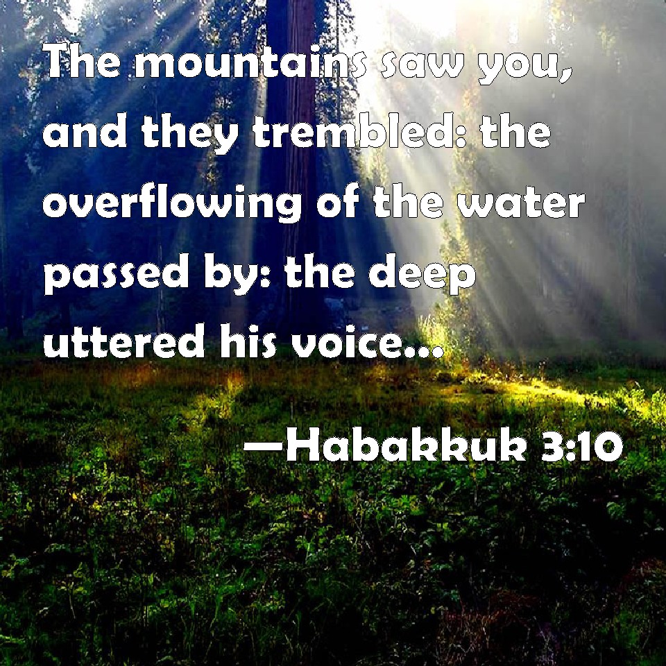 Choose a Background Habakkuk 3:10 The mountains saw you, and they trembled: the overflowing of the water passed by: the deep uttered his voice, and lifted up his hands on high. KJV: The mountains saw thee, and they trembled: the overflowing of the water passed by: the deep uttered his voice, and lifted up his hands on high. DRB: The mountains saw thee, and were grieved: the great body of waters passed away. The deep put forth its voice: the deep lifted up its hands. DBT: The mountains saw thee, they were in travail: Torrents of waters passed by; The deep uttered its voice, Lifted up its hands on high. ERV: The mountains saw thee, and were afraid; the tempest of waters passed by: the deep uttered his voice, and lifted up his hands on high. WBT: The mountains saw thee, and they trembled: the overflowing of the water passed by: the deep uttered his voice, and lifted up his hands on high. WEB: The mountains saw you, and were afraid. The storm of waters passed by. The deep roared and lifted up its hands on high. YLT: Seen thee — pained are mountains, An inundation of waters hath passed over, Given forth hath the deep its voice, High its hands it hath lifted up.Links Habakkuk 3:10 NIV • Habakkuk 3:10 NLT • Habakkuk 3:10 ESV • Habakkuk 3:10 NASB • Habakkuk 3:10 KJV • Habakkuk 3:10 Interlinear • Habakkuk 3:10 Commentaries • Habakkuk 3:10 Parallel Texts • Habakkuk 3:10 Bible Apps • Habakkuk 3:10 Parallel • Bible Hub |