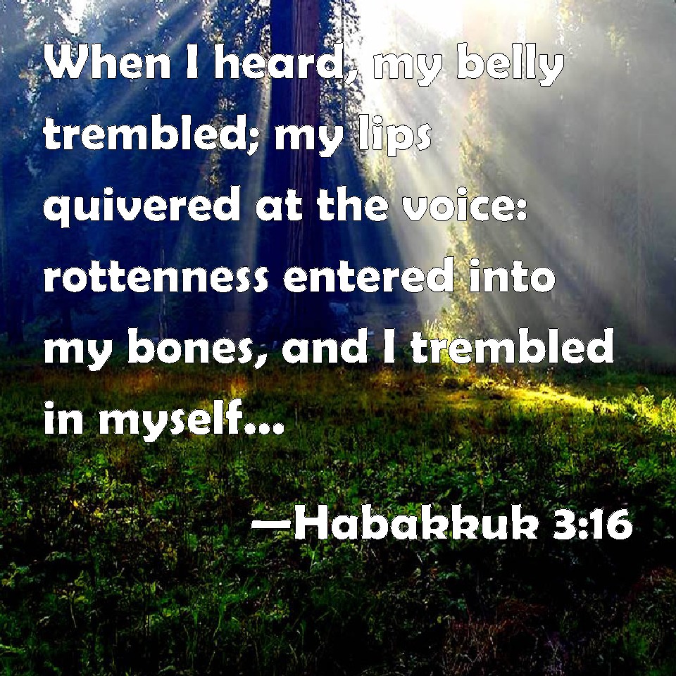 Choose a Background Habakkuk 3:16 When I heard, my belly trembled; my lips quivered at the voice: rottenness entered into my bones, and I trembled in myself, that I might rest in the day of trouble: when he comes up to the people, he will invade them with his troops. KJV: When I heard, my belly trembled; my lips quivered at the voice: rottenness entered into my bones, and I trembled in myself, that I might rest in the day of trouble: when he cometh up unto the people, he will invade them with his troops. DRB: I have heard and my bowels were troubled: my lips trembled at the voice. Let rottenness enter into my bones, and swarm under me. That I may rest in the day of tribulation: that I may go up to our people that are girded. DBT: I heard, and my belly trembled; My lips quivered at the voice; Rottenness entered into my bones, and I trembled in my place, That I might rest in the day of distress, When their invader shall come up against the people. ERV: I heard, and my belly trembled, my lips quivered at the voice; rottenness entered into my bones, and I trembled in my place: that I should rest in the day of trouble, when it cometh up against the people which invadeth him in troops. WBT: When I heard, my belly trembled; my lips quivered at the voice: rottenness entered into my bones, and I trembled in myself, that I might rest in the day of trouble: when he cometh up to the people, he will invade them with his troops. WEB: I heard, and my body trembled. My lips quivered at the voice. Rottenness enters into my bones, and I tremble in my place, because I must wait quietly for the day of trouble, for the coming up of the people who invade us. YLT: I have heard, and my belly trembleth, At the noise have my lips quivered, Rottenness doth come into my bones, And in my place I do tremble, That I rest for a day of distress, At the coming up of the people, he overcometh it.Links Habakkuk 3:16 NIV • Habakkuk 3:16 NLT • Habakkuk 3:16 ESV • Habakkuk 3:16 NASB • Habakkuk 3:16 KJV • Habakkuk 3:16 Interlinear • Habakkuk 3:16 Commentaries • Habakkuk 3:16 Parallel Texts • Habakkuk 3:16 Bible Apps • Habakkuk 3:16 Parallel • Bible Hub |