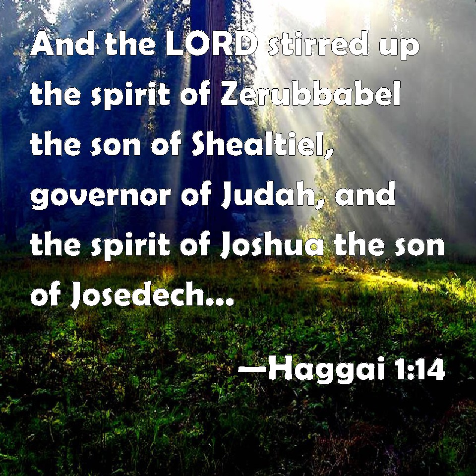 Choose a Background Haggai 1:14 And the LORD stirred up the spirit of Zerubbabel the son of Shealtiel, governor of Judah, and the spirit of Joshua the son of Josedech, the high priest, and the spirit of all the remnant of the people; and they came and did work in the house of the LORD of hosts, their God, KJV: And the LORD stirred up the spirit of Zerubbabel the son of Shealtiel, governor of Judah, and the spirit of Joshua the son of Josedech, the high priest, and the spirit of all the remnant of the people; and they came and did work in the house of the LORD of hosts, their God, DRB: And the Lord stirred up the spirit of Zorobabel the son of Salathiel governor of Juda, and the spirit of Jesus the son of Josedec the high priest, and the spirit of all the rest of the people: and they went in, and did the work in the house of the Lord of hosts their God. DBT: And Jehovah stirred up the spirit of Zerubbabel the son of Shealtiel, governor of Judah, and the spirit of Joshua the son of Jehozadak, the high priest, and the spirit of all the remnant of the people; and they came and worked at the house of Jehovah of hosts, their God, ERV: And the LORD stirred up the spirit of Zerubbabel the son of Shealtiel, governor of Judah, and the spirit of Joshua the son of Jehozadak, the high priest, and the spirit of all the remnant of the people; and they came and did work in the house of the LORD of hosts, their God, WBT: And the LORD stirred up the spirit of Zerubbabel the son of Shealtiel, governor of Judah, and the spirit of Joshua the son of Josedech, the high priest, and the spirit of all the remnant of the people; and they came and performed work in the house of the LORD of hosts, their God, WEB: Yahweh stirred up the spirit of Zerubbabel, the son of Shealtiel, governor of Judah, and the spirit of Joshua, the son of Jehozadak, the high priest, and the spirit of all the remnant of the people; and they came and worked on the house of Yahweh of Armies, their God, YLT: And Jehovah doth stir up the spirit of Zerubbabel son of Shealtiel, governor of Judah, and the spirit of Joshua son of Josedech, the high priest, and the spirit of all the remnant of the people, and they come in, and do work in the house of Jehovah of Hosts their God,Links Haggai 1:14 NIV • Haggai 1:14 NLT • Haggai 1:14 ESV • Haggai 1:14 NASB • Haggai 1:14 KJV • Haggai 1:14 Interlinear • Haggai 1:14 Commentaries • Haggai 1:14 Parallel Texts • Haggai 1:14 Bible Apps • Haggai 1:14 Parallel • Bible Hub |