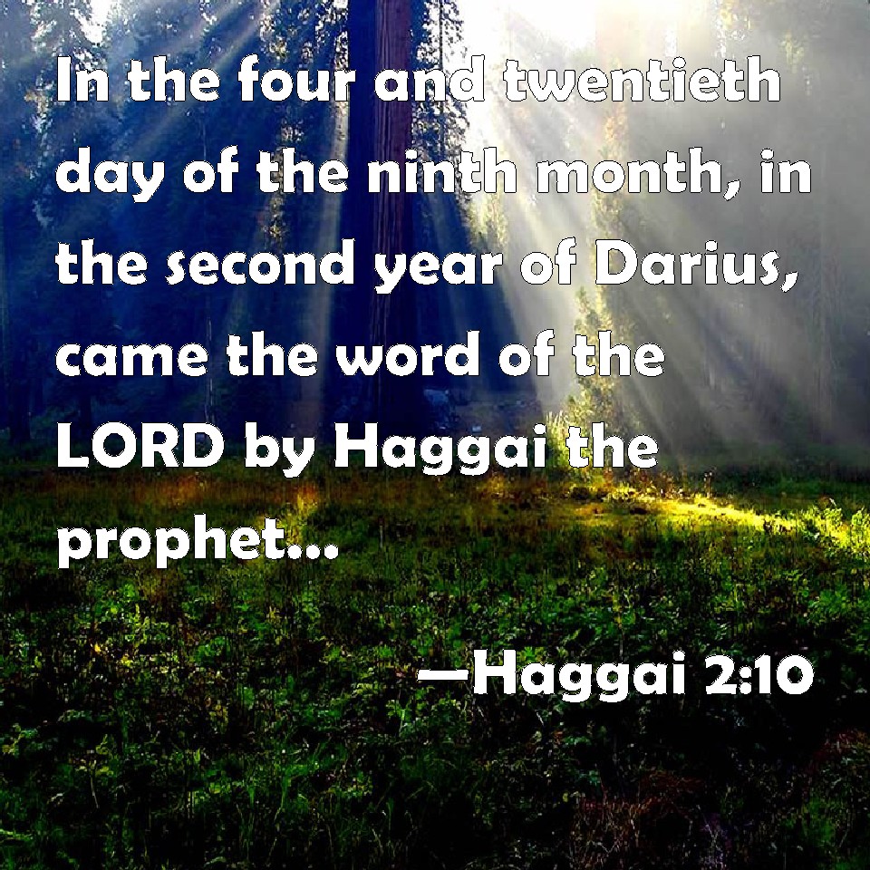 Choose a Background Haggai 2:10 In the four and twentieth day of the ninth month, in the second year of Darius, came the word of the LORD by Haggai the prophet, saying, KJV: In the four and twentieth day of the ninth month, in the second year of Darius, came the word of the LORD by Haggai the prophet, saying, DRB: In the four and twentieth day of the ninth month, in the second year of Darius the king, the word of the Lord came to Aggeus the prophet, saying: DBT: On the four and twentieth day of the ninth month, in the second year of Darius, came the word of Jehovah by Haggai the prophet, saying, ERV: In the four and twentieth day of the ninth month, in the second year of Darius, came the word of the LORD by Haggai the prophet, saying, WBT: In the four and twentieth day of the ninth month, in the second year of Darius, came the word of the LORD by Haggai the prophet, saying, WEB: In the twenty-fourth day of the ninth month, in the second year of Darius, the Word of Yahweh came by Haggai the prophet, saying, YLT: On the twenty and fourth of the ninth month, in the second year of Darius, hath a word of Jehovah been by the hand of Haggai the prophet, saying:Links Haggai 2:10 NIV • Haggai 2:10 NLT • Haggai 2:10 ESV • Haggai 2:10 NASB • Haggai 2:10 KJV • Haggai 2:10 Interlinear • Haggai 2:10 Commentaries • Haggai 2:10 Parallel Texts • Haggai 2:10 Bible Apps • Haggai 2:10 Parallel • Bible Hub |