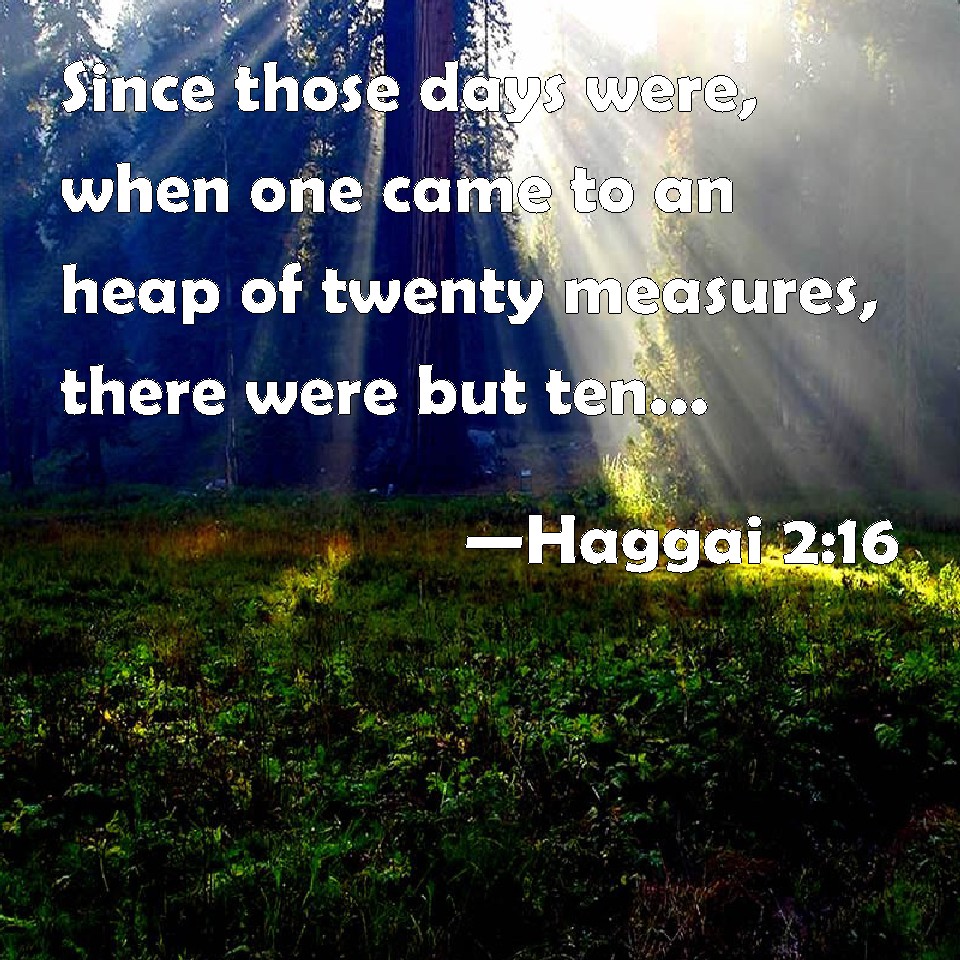 Choose a Background Haggai 2:16 Since those days were, when one came to an heap of twenty measures, there were but ten: when one came to the fat press for to draw out fifty vessels out of the press, there were but twenty. KJV: Since those days were, when one came to an heap of twenty measures, there were but ten: when one came to the pressfat for to draw out fifty vessels out of the press, there were but twenty. DRB: When you went to a heap of twenty bushels, and they became ten: and you went into the press, to press out fifty vessels, and they became twenty. DBT: before those days were, when one came to a heap of twenty measures, there were but ten; when one came to the vat to draw out fifty press-measures, there were but twenty. ERV: Through all that time, when one came to an heap of twenty measures, there were but ten; when one came to the winefat for to draw out fifty vessels, there were but twenty. WBT: Since those days were, when one came to a heap of twenty measures, there were but ten: when one came to the press-vat to draw out fifty vessels out of the press, there were but twenty. WEB: Through all that time, when one came to a heap of twenty measures, there were only ten. When one came to the wine vat to draw out fifty, there were only twenty. YLT: From that time one hath come to a heap of twenty, And it hath been ten, He hath come unto the wine-fat to draw out fifty purahs, And it hath been twenty.Links Haggai 2:16 NIV • Haggai 2:16 NLT • Haggai 2:16 ESV • Haggai 2:16 NASB • Haggai 2:16 KJV • Haggai 2:16 Interlinear • Haggai 2:16 Commentaries • Haggai 2:16 Parallel Texts • Haggai 2:16 Bible Apps • Haggai 2:16 Parallel • Bible Hub |
