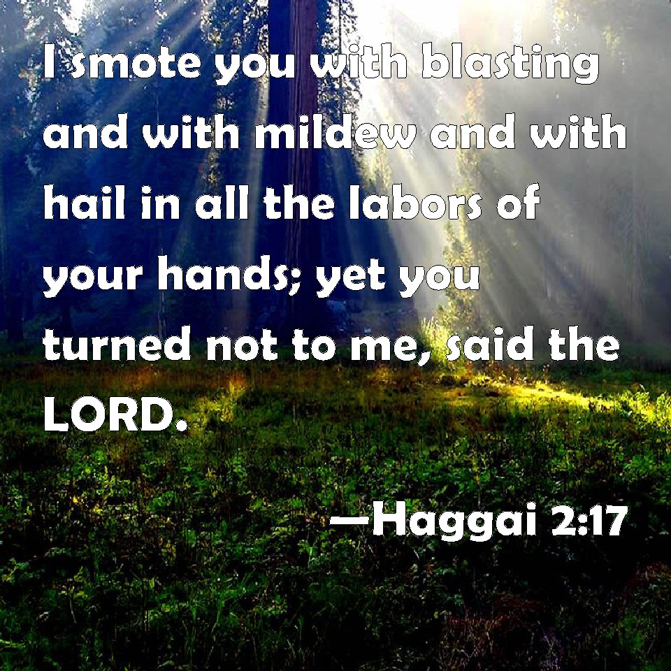 Choose a Background Haggai 2:17 I smote you with blasting and with mildew and with hail in all the labors of your hands; yet you turned not to me, said the LORD. KJV: I smote you with blasting and with mildew and with hail in all the labours of your hands; yet ye turned not to me, saith the LORD. DRB: I struck you with a blasting wind, and all the works of your hand with the mildew and with hail, yet there was none among you that returned to me, saith the Lord. DBT: I smote you with blasting and with mildew and with hail in all the work of your hands; and ye turned not to me, saith Jehovah. ERV: I smote you with blasting and with mildew and with hail in all the work of your hands; yet ye turned not to me, saith the LORD. WBT: I smote you with blasting and with mildew and with hail in all the labors of your hands; yet ye turned not to me, saith the LORD. WEB: I struck you with blight, mildew, and hail in all the work of your hands; yet you didn't turn to me,' says Yahweh. YLT: I have smitten you with blasting, And with mildew, and with hail — All the work of your hands, And there is none of you with Me, An affirmation of Jehovah.Links Haggai 2:17 NIV • Haggai 2:17 NLT • Haggai 2:17 ESV • Haggai 2:17 NASB • Haggai 2:17 KJV • Haggai 2:17 Interlinear • Haggai 2:17 Commentaries • Haggai 2:17 Parallel Texts • Haggai 2:17 Bible Apps • Haggai 2:17 Parallel • Bible Hub |