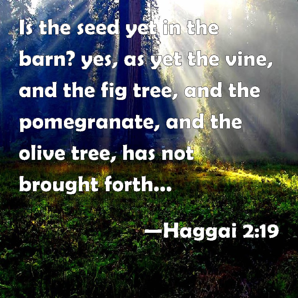 Choose a Background Haggai 2:19 Is the seed yet in the barn? yes, as yet the vine, and the fig tree, and the pomegranate, and the olive tree, has not brought forth: from this day will I bless you. KJV: Is the seed yet in the barn? yea, as yet the vine, and the fig tree, and the pomegranate, and the olive tree, hath not brought forth: from this day will I bless you. DRB: Is the seed as yet sprung up? or hath the vine, and the fig tree, and the pomegranate, and the olive tree as yet flourished? from this day I will bless you. DBT: Is the seed yet in the barn? yea, the vine, and the fig-tree, and the pomegranate, and the olive-tree have not brought forth: from this day will I bless you. ERV: Is the seed yet in the barn? yea, the vine, and the fig tree, and the pomegranate, and the olive tree hath not brought forth; from this day will I bless you. WBT: Is the seed yet in the barn? yes, as yet the vine, and the fig-tree, and the pomegranate, and the olive-tree, hath not brought forth: from this day will I bless you. WEB: Is the seed yet in the barn? Yes, the vine, the fig tree, the pomegranate, and the olive tree haven't brought forth. From this day will I bless you.'" YLT: Is the seed yet in the barn? And hitherto the vine and the fig, And the pomegranate, and the olive-tree, Have not borne — from this day I bless.'Links Haggai 2:19 NIV • Haggai 2:19 NLT • Haggai 2:19 ESV • Haggai 2:19 NASB • Haggai 2:19 KJV • Haggai 2:19 Interlinear • Haggai 2:19 Commentaries • Haggai 2:19 Parallel Texts • Haggai 2:19 Bible Apps • Haggai 2:19 Parallel • Bible Hub |