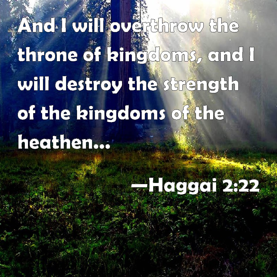 Choose a Background Haggai 2:22 And I will overthrow the throne of kingdoms, and I will destroy the strength of the kingdoms of the heathen; and I will overthrow the chariots, and those that ride in them; and the horses and their riders shall come down, every one by the sword of his brother. KJV: And I will overthrow the throne of kingdoms, and I will destroy the strength of the kingdoms of the heathen; and I will overthrow the chariots, and those that ride in them; and the horses and their riders shall come down, every one by the sword of his brother. DRB: And I will overthrow the throne of kingdoms, and will destroy the strength of the kingdom of the Gentiles: and I will overthrow the chariot, and him that rideth therein: and the horses and their riders shall come down, every one by the sword of his brother. DBT: and I will overthrow the throne of kingdoms, and I will destroy the strength of the kingdoms of the nations; and I will overthrow the chariots, and those that ride therein; and the horses and their riders shall come down, every one by the sword of his brother. ERV: and I will overthrow the throne of kingdoms, and I will destroy the strength of the kingdoms of the nations; and I will overthrow the chariots, and those that ride in them; and the horses and their riders shall come down, every one by the sword of his brother. WBT: And I will overthrow the throne of kingdoms, and I will destroy the strength of the kingdoms of the heathen: and I will overthrow the chariots, and those that ride in them; and the horses and their riders shall come down, every one by the sword of his brother. WEB: I will overthrow the throne of kingdoms. I will destroy the strength of the kingdoms of the nations. I will overthrow the chariots, and those who ride in them. The horses and their riders will come down, everyone by the sword of his brother. YLT: And have overturned the throne of kingdoms, And I have destroyed the strength of kingdoms of the nations, And overturned chariot and its charioteers, And come down have horses and their riders, Each by the sword of his brother.Links Haggai 2:22 NIV • Haggai 2:22 NLT • Haggai 2:22 ESV • Haggai 2:22 NASB • Haggai 2:22 KJV • Haggai 2:22 Interlinear • Haggai 2:22 Commentaries • Haggai 2:22 Parallel Texts • Haggai 2:22 Bible Apps • Haggai 2:22 Parallel • Bible Hub |