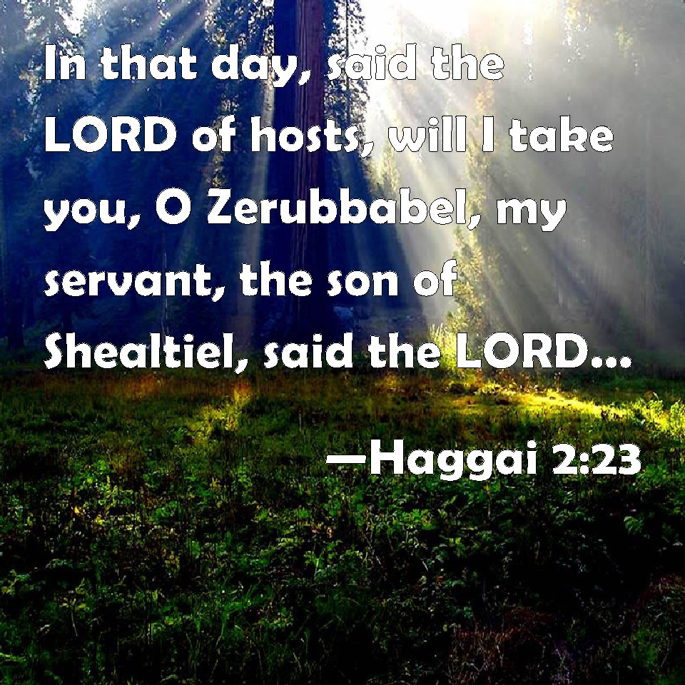 Choose a Background Haggai 2:23 In that day, said the LORD of hosts, will I take you, O Zerubbabel, my servant, the son of Shealtiel, said the LORD, and will make you as a signet: for I have chosen you, said the LORD of hosts. KJV: In that day, saith the LORD of hosts, will I take thee, O Zerubbabel, my servant, the son of Shealtiel, saith the LORD, and will make thee as a signet: for I have chosen thee, saith the LORD of hosts. DRB: In that day, saith the Lord of hosts, I will take thee, O Zorobabel the son of Salathiel, my servant, saith the Lord, and will make thee as a signet, for I have chosen thee, saith the Lord of hosts. DBT: In that day, saith Jehovah of hosts, will I take thee, Zerubbabel son of Shealtiel, my servant, saith Jehovah, and will make thee as a signet; for I have chosen thee, saith Jehovah of hosts. ERV: In that day, saith the LORD of hosts, will I take thee, O Zerubbabel, my servant, the son of Shealtiel, saith the LORD, and will make thee as a signet: for I have chosen thee, saith the LORD of hosts. WBT: In that day, saith the LORD of hosts, will I take thee, O Zerubbabel, my servant, the son of Shealtiel, saith the LORD, and will make thee as a signet; for I have chosen thee, saith the LORD of hosts. WEB: In that day, says Yahweh of Armies, will I take you, Zerubbabel, my servant, the son of Shealtiel,' says Yahweh, 'and will make you as a signet, for I have chosen you,' says Yahweh of Armies." YLT: In that day — an affirmation of Jehovah of Hosts, I take thee, Zerubbabel, son of Shealtiel, My servant — an affirmation of Jehovah, And have set thee as a signet, for on thee I have fixed, An affirmation of Jehovah of Hosts!Links Haggai 2:23 NIV • Haggai 2:23 NLT • Haggai 2:23 ESV • Haggai 2:23 NASB • Haggai 2:23 KJV • Haggai 2:23 Interlinear • Haggai 2:23 Commentaries • Haggai 2:23 Parallel Texts • Haggai 2:23 Bible Apps • Haggai 2:23 Parallel • Bible Hub |