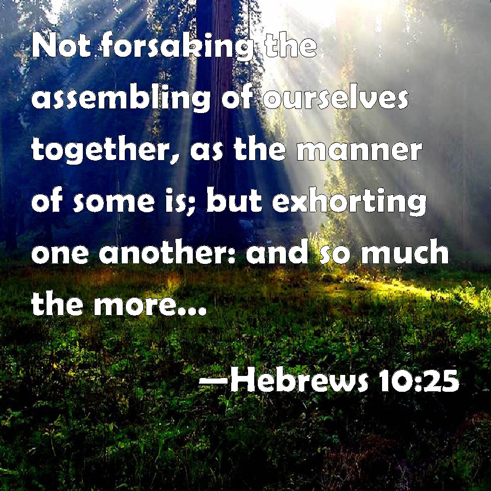 Choose a Background Hebrews 10:25 Not forsaking the assembling of ourselves together, as the manner of some is; but exhorting one another: and so much the more, as you see the day approaching. KJV: Not forsaking the assembling of ourselves together, as the manner of some is; but exhorting one another: and so much the more, as ye see the day approaching. DRB: Not forsaking our assembly, as some are accustomed; but comforting one another, and so much the more as you see the day approaching. DBT: not forsaking the assembling of ourselves together, as the custom is with some; but encouraging one another, and by so much the more as ye see the day drawing near. ERV: not forsaking the assembling of ourselves together, as the custom of some is, but exhorting one another; and so much the more, as ye see the day drawing nigh. WBT: Not forsaking the assembling of ourselves, as the manner of some is; but exhorting one another: and so much the more, as ye see the day approaching. WEB: not forsaking our own assembling together, as the custom of some is, but exhorting one another; and so much the more, as you see the Day approaching. YLT: not forsaking the assembling of ourselves together, as a custom of certain is, but exhorting, and so much the more as ye see the day coming nigh.Links Hebrews 10:25 NIV • Hebrews 10:25 NLT • Hebrews 10:25 ESV • Hebrews 10:25 NASB • Hebrews 10:25 KJV • Hebrews 10:25 Interlinear • Hebrews 10:25 Commentaries • Hebrews 10:25 Parallel Texts • Hebrews 10:25 Bible Apps • Hebrews 10:25 Parallel • Bible Hub |