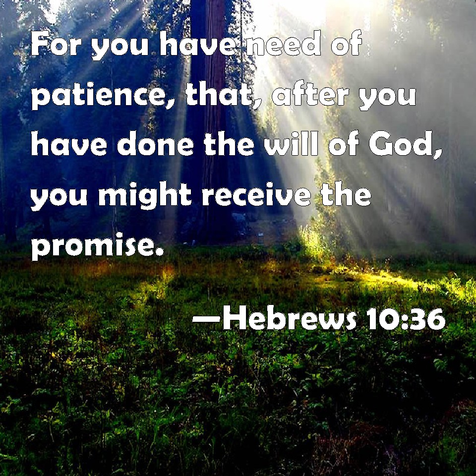Choose a Background Hebrews 10:36 For you have need of patience, that, after you have done the will of God, you might receive the promise. KJV: For ye have need of patience, that, after ye have done the will of God, ye might receive the promise. DRB: For patience is necessary for you; that, doing the will of God, you may receive the promise. DBT: For ye have need of endurance in order that, having done the will of God, ye may receive the promise. ERV: For ye have need of patience, that, having done the will of God, ye may receive the promise. WBT: For ye have need of patience, that, after ye have done the will of God, ye may receive the promise. WEB: For you need endurance so that, having done the will of God, you may receive the promise. YLT: for of patience ye have need, that the will of God having done, ye may receive the promise,Links Hebrews 10:36 NIV • Hebrews 10:36 NLT • Hebrews 10:36 ESV • Hebrews 10:36 NASB • Hebrews 10:36 KJV • Hebrews 10:36 Interlinear • Hebrews 10:36 Commentaries • Hebrews 10:36 Parallel Texts • Hebrews 10:36 Bible Apps • Hebrews 10:36 Parallel • Bible Hub |