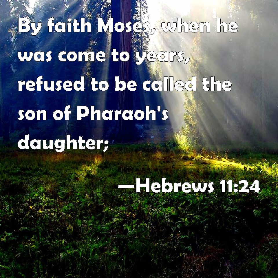 Choose a Background Hebrews 11:24 By faith Moses, when he was come to years, refused to be called the son of Pharaoh's daughter; KJV: By faith Moses, when he was come to years, refused to be called the son of Pharaoh's daughter; DRB: By faith Moses, when he was grown up, denied himself to be the son of Pharao's daughter; DBT: By faith Moses, when he had become great, refused to be called son of Pharaoh's daughter; ERV: By faith Moses, when he was grown up, refused to be called the son of Pharaoh's daughter; WBT: By faith Moses, when he had come to years, refused to be called the son of Pharaoh's daughter; WEB: By faith, Moses, when he had grown up, refused to be called the son of Pharaoh's daughter, YLT: by faith Moses, having become great, did refuse to be called a son of the daughter of Pharaoh,Links Hebrews 11:24 NIV • Hebrews 11:24 NLT • Hebrews 11:24 ESV • Hebrews 11:24 NASB • Hebrews 11:24 KJV • Hebrews 11:24 Interlinear • Hebrews 11:24 Commentaries • Hebrews 11:24 Parallel Texts • Hebrews 11:24 Bible Apps • Hebrews 11:24 Parallel • Bible Hub |