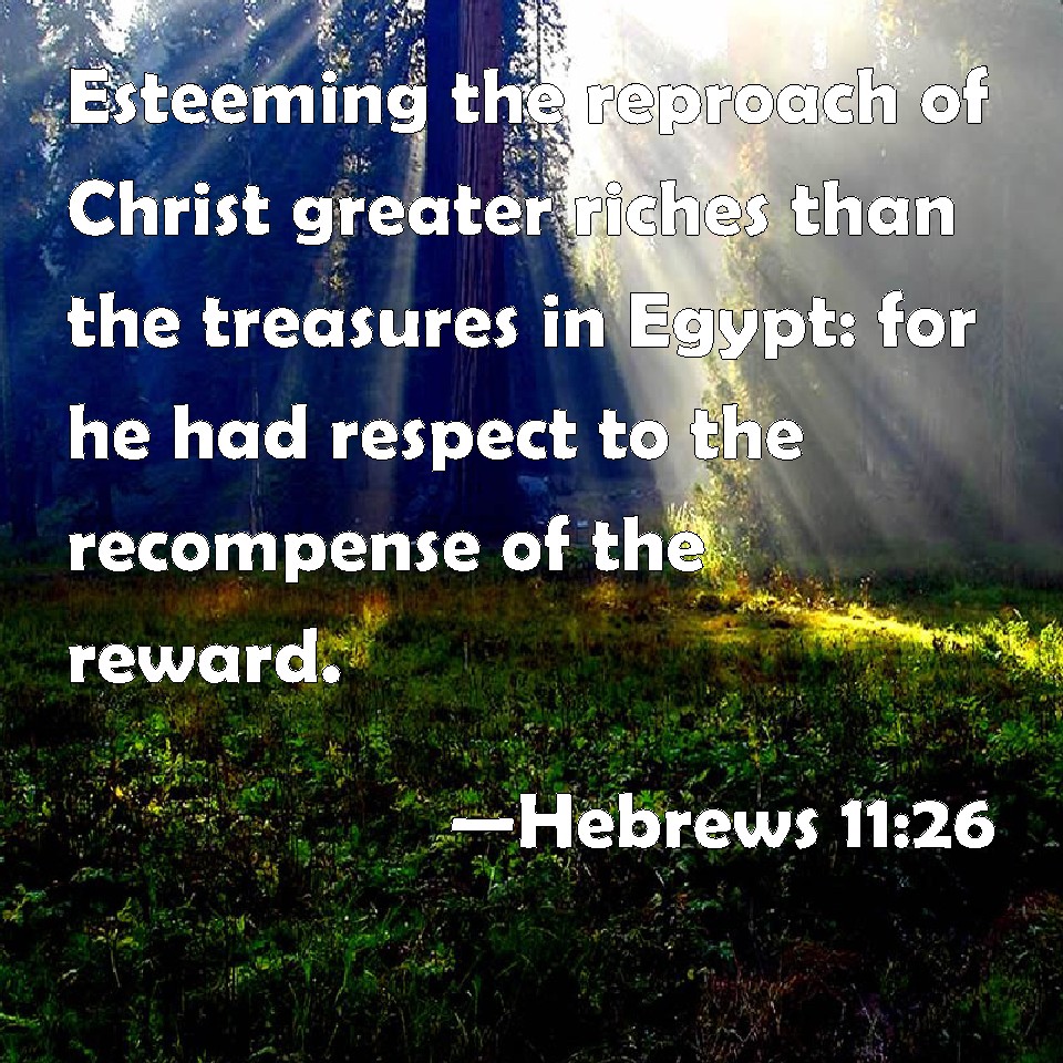 Hebrews 11:26 Esteeming the reproach of Christ greater riches than the treasures in Egypt: for he had respect to the recompense of the reward.