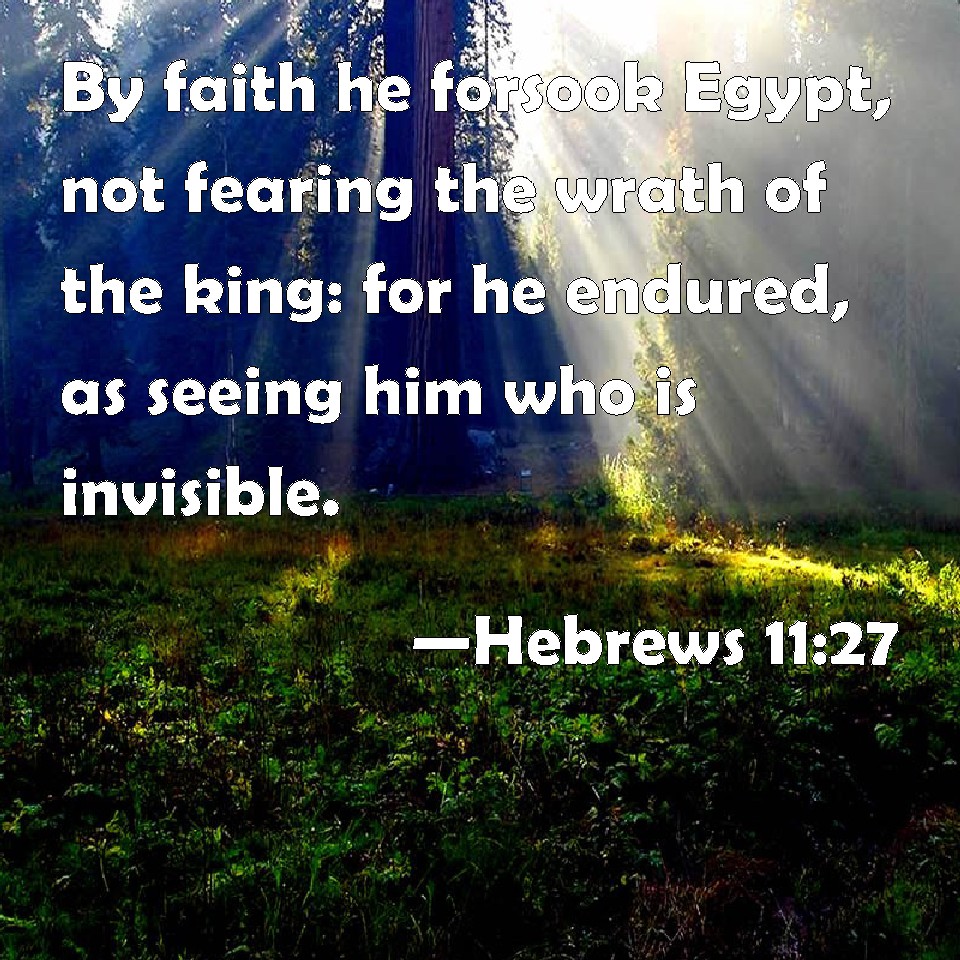 Choose a Background Hebrews 11:27 By faith he forsook Egypt, not fearing the wrath of the king: for he endured, as seeing him who is invisible. KJV: By faith he forsook Egypt, not fearing the wrath of the king: for he endured, as seeing him who is invisible. DRB: By faith he left Egypt, not fearing the fierceness of the king: for he endured as seeing him that is invisible. DBT: By faith he left Egypt, not fearing the wrath of the king; for he persevered, as seeing him who is invisible. ERV: By faith he forsook Egypt, not fearing the wrath of the king: for he endured, as seeing him who is invisible. WBT: By faith he forsook Egypt, not fearing the wrath of the king: for he endured, as seeing him who is invisible. WEB: By faith, he left Egypt, not fearing the wrath of the king; for he endured, as seeing him who is invisible. YLT: by faith he left Egypt behind, not having been afraid of the wrath of the king, for, as seeing the Invisible One — he endured;Links Hebrews 11:27 NIV • Hebrews 11:27 NLT • Hebrews 11:27 ESV • Hebrews 11:27 NASB • Hebrews 11:27 KJV • Hebrews 11:27 Interlinear • Hebrews 11:27 Commentaries • Hebrews 11:27 Parallel Texts • Hebrews 11:27 Bible Apps • Hebrews 11:27 Parallel • Bible Hub |