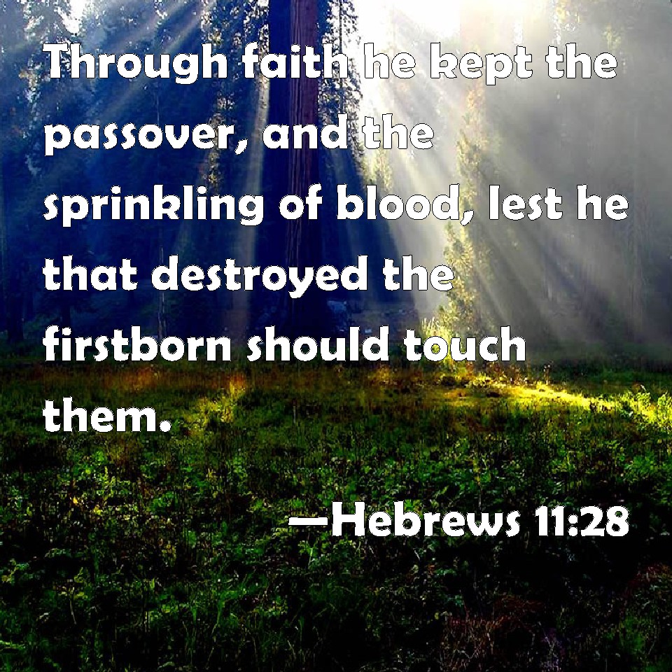 Choose a Background Hebrews 11:28 Through faith he kept the passover, and the sprinkling of blood, lest he that destroyed the firstborn should touch them. KJV: Through faith he kept the passover, and the sprinkling of blood, lest he that destroyed the firstborn should touch them. DRB: By faith he celebrated the pasch, and the shedding of the blood; that he, who destroyed the firstborn, might not touch them. DBT: By faith he celebrated the passover and the sprinkling of the blood, that the destroyer of the firstborn might not touch them. ERV: By faith he kept the passover, and the sprinkling of the blood, that the destroyer of the firstborn should not touch them. WBT: Through faith he kept the passover, and the sprinkling of blood, lest he that destroyed the first-born should touch them. WEB: By faith, he kept the Passover, and the sprinkling of the blood, that the destroyer of the firstborn should not touch them. YLT: by faith he kept the passover, and the sprinkling of the blood, that He who is destroying the first-born might not touch them.Links Hebrews 11:28 NIV • Hebrews 11:28 NLT • Hebrews 11:28 ESV • Hebrews 11:28 NASB • Hebrews 11:28 KJV • Hebrews 11:28 Interlinear • Hebrews 11:28 Commentaries • Hebrews 11:28 Parallel Texts • Hebrews 11:28 Bible Apps • Hebrews 11:28 Parallel • Bible Hub |
