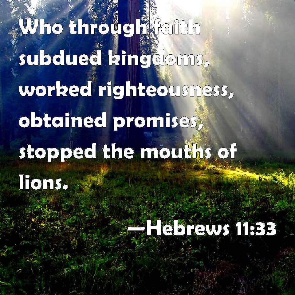 Choose a Background Hebrews 11:33 Who through faith subdued kingdoms, worked righteousness, obtained promises, stopped the mouths of lions. KJV: Who through faith subdued kingdoms, wrought righteousness, obtained promises, stopped the mouths of lions, DRB: Who by faith conquered kingdoms, wrought justice, obtained promises, stopped the mouths of lions, DBT: who by faith overcame kingdoms, wrought righteousness, obtained promises, stopped lions' mouths, ERV: who through faith subdued kingdoms, wrought righteousness, obtained promises, stopped the mouths of lions, WBT: Who through faith subdued kingdoms, wrought righteousness, obtained promises, stopped the mouths of lions, WEB: who, through faith subdued kingdoms, worked out righteousness, obtained promises, stopped the mouths of lions, YLT: who through faith did subdue kingdoms, wrought righteousness, obtained promises, stopped mouths of lions,Links Hebrews 11:33 NIV • Hebrews 11:33 NLT • Hebrews 11:33 ESV • Hebrews 11:33 NASB • Hebrews 11:33 KJV • Hebrews 11:33 Interlinear • Hebrews 11:33 Commentaries • Hebrews 11:33 Parallel Texts • Hebrews 11:33 Bible Apps • Hebrews 11:33 Parallel • Bible Hub |