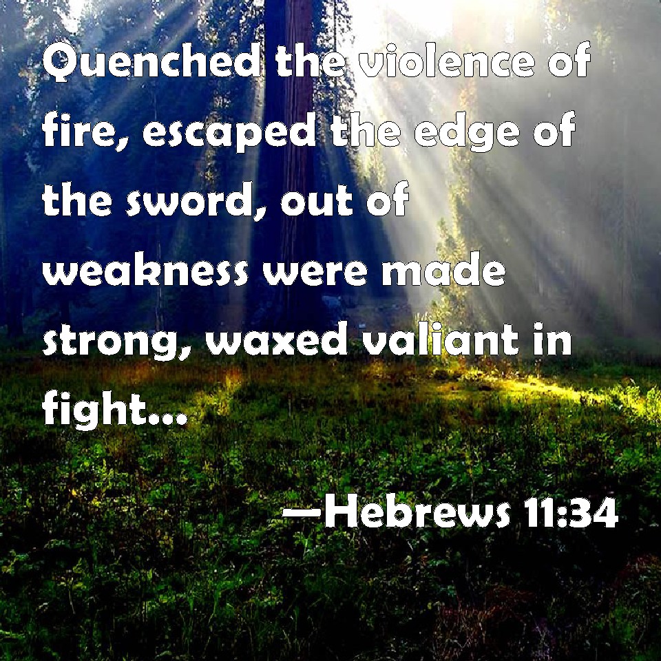 Choose a Background Hebrews 11:34 Quenched the violence of fire, escaped the edge of the sword, out of weakness were made strong, waxed valiant in fight, turned to flight the armies of the aliens. KJV: Quenched the violence of fire, escaped the edge of the sword, out of weakness were made strong, waxed valiant in fight, turned to flight the armies of the aliens. DRB: Quenched the violence of fire, escaped the edge of the sword, recovered strength from weakness, became valiant in battle, put to flight the armies of foreigners: DBT: quenched the power of fire, escaped the edge of the sword, became strong out of weakness, became mighty in war, made the armies of strangers give way. ERV: quenched the power of fire, escaped the edge of the sword, from weakness were made strong, waxed mighty in war, turned to flight armies of aliens. WBT: Quenched the violence of fire, escaped the edge of the sword, out of weakness were made strong, became valiant in fight, turned to flight the armies of the aliens. WEB: quenched the power of fire, escaped the edge of the sword, from weakness were made strong, grew mighty in war, and caused foreign armies to flee. YLT: quenched the power of fire, escaped the mouth of the sword, were made powerful out of infirmities, became strong in battle, caused to give way camps of the aliens.Links Hebrews 11:34 NIV • Hebrews 11:34 NLT • Hebrews 11:34 ESV • Hebrews 11:34 NASB • Hebrews 11:34 KJV • Hebrews 11:34 Interlinear • Hebrews 11:34 Commentaries • Hebrews 11:34 Parallel Texts • Hebrews 11:34 Bible Apps • Hebrews 11:34 Parallel • Bible Hub |