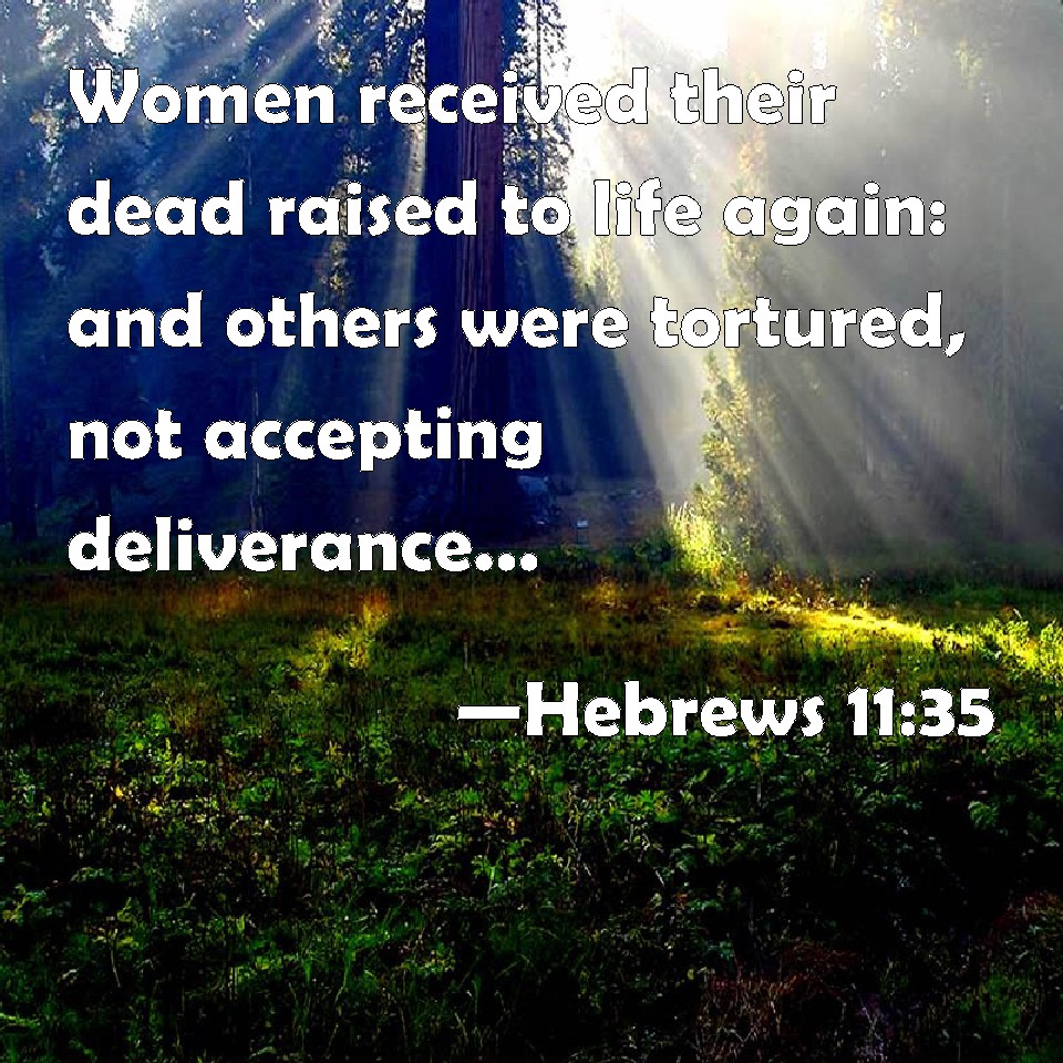 Choose a Background Hebrews 11:35 Women received their dead raised to life again: and others were tortured, not accepting deliverance; that they might obtain a better resurrection: KJV: Women received their dead raised to life again: and others were tortured, not accepting deliverance; that they might obtain a better resurrection: DRB: Women received their dead raised to life again. But others were racked, not accepting deliverance, that they might find a better resurrection. DBT: Women received their dead again by resurrection; and others were tortured, not having accepted deliverance, that they might get a better resurrection; ERV: Women received their dead by a resurrection: and others were tortured, not accepting their deliverance; that they might obtain a better resurrection: WBT: Women received their dead raised to life again: and others were tortured, not accepting deliverance; that they might obtain a better resurrection: WEB: Women received their dead by resurrection. Others were tortured, not accepting their deliverance, that they might obtain a better resurrection. YLT: Women received by a rising again their dead, and others were tortured, not accepting the redemption, that a better rising again they might receive,Links Hebrews 11:35 NIV • Hebrews 11:35 NLT • Hebrews 11:35 ESV • Hebrews 11:35 NASB • Hebrews 11:35 KJV • Hebrews 11:35 Interlinear • Hebrews 11:35 Commentaries • Hebrews 11:35 Parallel Texts • Hebrews 11:35 Bible Apps • Hebrews 11:35 Parallel • Bible Hub |