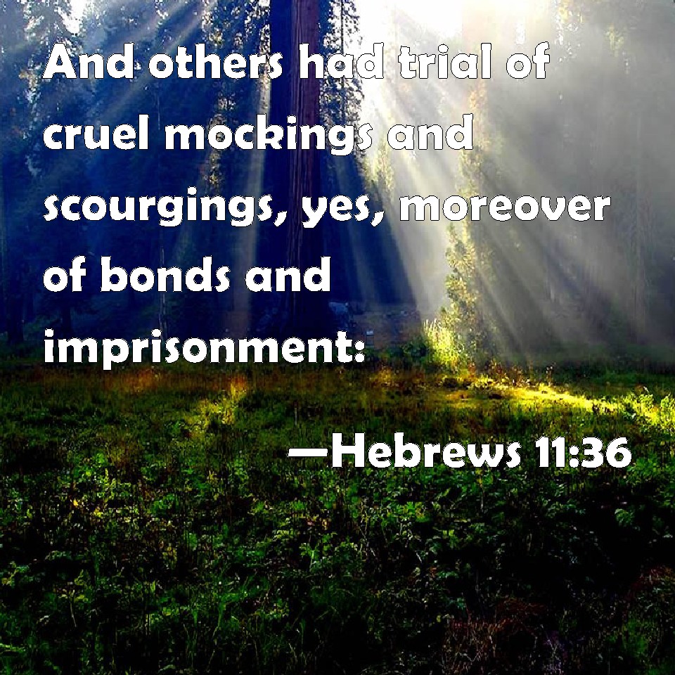 Choose a Background Hebrews 11:36 And others had trial of cruel mockings and scourgings, yes, moreover of bonds and imprisonment: KJV: And others had trial of cruel mockings and scourgings, yea, moreover of bonds and imprisonment: DRB: And others had trial of mockeries and stripes, moreover also of bands and prisons. DBT: and others underwent trial of mockings and scourgings, yea, and of bonds and imprisonment. ERV: and others had trial of mockings and scourgings, yea, moreover of bonds and imprisonment: WBT: And others had trial of cruel mockings and scourgings, and, moreover of bonds and imprisonment: WEB: Others were tried by mocking and scourging, yes, moreover by bonds and imprisonment. YLT: and others of mockings and scourgings did receive trial, and yet of bonds and imprisonment;Links Hebrews 11:36 NIV • Hebrews 11:36 NLT • Hebrews 11:36 ESV • Hebrews 11:36 NASB • Hebrews 11:36 KJV • Hebrews 11:36 Interlinear • Hebrews 11:36 Commentaries • Hebrews 11:36 Parallel Texts • Hebrews 11:36 Bible Apps • Hebrews 11:36 Parallel • Bible Hub |