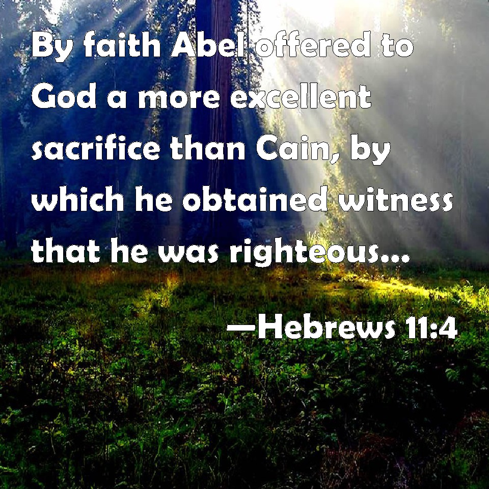 Choose a Background Hebrews 11:4 By faith Abel offered to God a more excellent sacrifice than Cain, by which he obtained witness that he was righteous, God testifying of his gifts: and by it he being dead yet speaks. KJV: By faith Abel offered unto God a more excellent sacrifice than Cain, by which he obtained witness that he was righteous, God testifying of his gifts: and by it he being dead yet speaketh. DRB: By faith Abel offered to God a sacrifice exceeding that of Cain, by which he obtained a testimony that he was just, God giving testimony to his gifts; and by it he being dead yet speaketh. DBT: By faith Abel offered to God a more excellent sacrifice than Cain, by which he obtained testimony of being righteous, God bearing testimony to his gifts, and by it, having died, he yet speaks. ERV: By faith Abel offered unto God a more excellent sacrifice than Cain, through which he had witness borne to him that he was righteous, God bearing witness in respect of his gifts: and through it he being dead yet speaketh. WBT: By faith Abel offered to God a more excellent sacrifice than Cain, by which he obtained testimony that he was righteous, God testifying of his gifts: and by it he being dead yet speaketh. WEB: By faith, Abel offered to God a more excellent sacrifice than Cain, through which he had testimony given to him that he was righteous, God testifying with respect to his gifts; and through it he, being dead, still speaks. YLT: by faith a better sacrifice did Abel offer to God than Cain, through which he was testified to be righteous, God testifying of his gifts, and through it, he being dead, doth yet speak.Links Hebrews 11:4 NIV • Hebrews 11:4 NLT • Hebrews 11:4 ESV • Hebrews 11:4 NASB • Hebrews 11:4 KJV • Hebrews 11:4 Interlinear • Hebrews 11:4 Commentaries • Hebrews 11:4 Parallel Texts • Hebrews 11:4 Bible Apps • Hebrews 11:4 Parallel • Bible Hub |