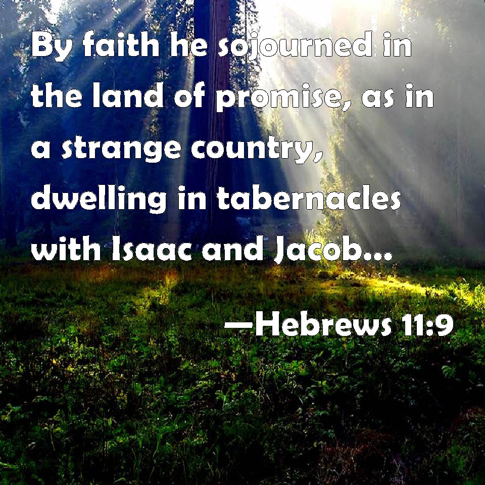 Choose a Background Hebrews 11:9 By faith he sojourned in the land of promise, as in a strange country, dwelling in tabernacles with Isaac and Jacob, the heirs with him of the same promise: KJV: By faith he sojourned in the land of promise, as in a strange country, dwelling in tabernacles with Isaac and Jacob, the heirs with him of the same promise: DRB: By faith he abode in the land, dwelling in cottages, with Isaac and Jacob, the co-heirs of the same promise. DBT: By faith he sojourned as a stranger in the land of promise as a foreign country, having dwelt in tents with Isaac and Jacob, the heirs with him of the same promise; ERV: By faith he became a sojourner in the land of promise, as in a land not his own, dwelling in tents, with Isaac and Jacob, the heirs with him of the same promise: WBT: By faith he sojourned in the land of promise, as in a foreign country, dwelling in tabernacles with Isaac and Jacob, the heirs with him of the same promise: WEB: By faith, he lived as an alien in the land of promise, as in a land not his own, dwelling in tents, with Isaac and Jacob, the heirs with him of the same promise. YLT: by faith he did sojourn in the land of the promise as a strange country, in tabernacles having dwelt with Isaac and Jacob, fellow-heirs of the same promise,Links Hebrews 11:9 NIV • Hebrews 11:9 NLT • Hebrews 11:9 ESV • Hebrews 11:9 NASB • Hebrews 11:9 KJV • Hebrews 11:9 Interlinear • Hebrews 11:9 Commentaries • Hebrews 11:9 Parallel Texts • Hebrews 11:9 Bible Apps • Hebrews 11:9 Parallel • Bible Hub |