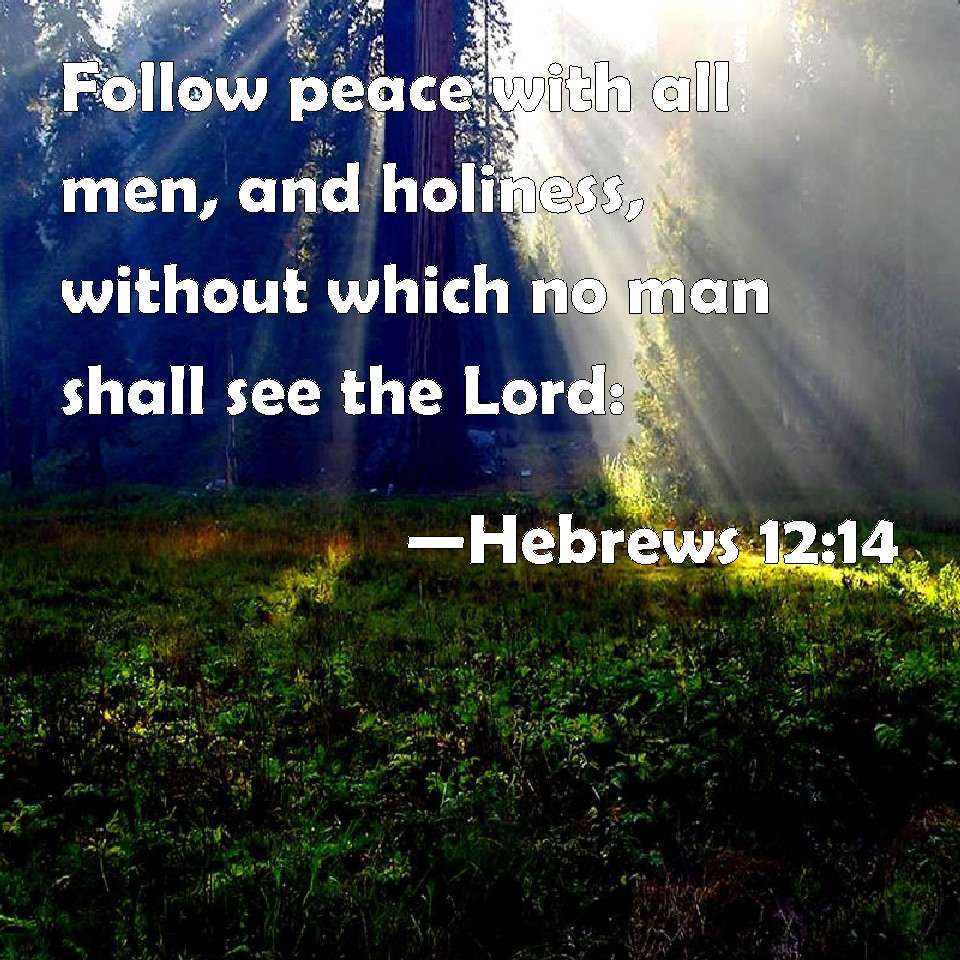 Choose a Background Hebrews 12:14 Follow peace with all men, and holiness, without which no man shall see the Lord: KJV: Follow peace with all men, and holiness, without which no man shall see the Lord: DRB: Follow peace with all men, and holiness: without which no man shall see God. DBT: Pursue peace with all, and holiness, without which no one shall see the Lord: ERV: Follow after peace with all men, and the sanctification without which no man shall see the Lord: WBT: Follow peace with all men, and holiness, without which no man shall see the Lord: WEB: Follow after peace with all men, and the sanctification without which no man will see the Lord, YLT: peace pursue with all, and the separation, apart from which no one shall see the Lord,Links Hebrews 12:14 NIV • Hebrews 12:14 NLT • Hebrews 12:14 ESV • Hebrews 12:14 NASB • Hebrews 12:14 KJV • Hebrews 12:14 Interlinear • Hebrews 12:14 Commentaries • Hebrews 12:14 Parallel Texts • Hebrews 12:14 Bible Apps • Hebrews 12:14 Parallel • Bible Hub |