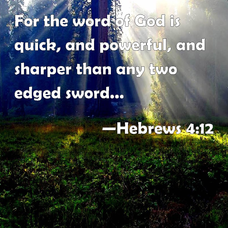 Choose a Background Hebrews 4:12 For the word of God is quick, and powerful, and sharper than any two edged sword, piercing even to the dividing asunder of soul and spirit, and of the joints and marrow, and is a discerner of the thoughts and intents of the heart. KJV: For the word of God is quick, and powerful, and sharper than any twoedged sword, piercing even to the dividing asunder of soul and spirit, and of the joints and marrow, and is a discerner of the thoughts and intents of the heart. DRB: For the word of God is living and effectual, and more piercing than any two edged sword; and reaching unto the division of the soul and the spirit, of the joints also and the marrow, and is a discerner of the thoughts and intents of the heart. DBT: For the word of God is living and operative, and sharper than any two-edged sword, and penetrating to the division of soul and spirit, both of joints and marrow, and a discerner of the thoughts and intents of the heart. ERV: For the word of God is living, and active, and sharper than any two-edged sword, and piercing even to the dividing of soul and spirit, of both joints and marrow, and quick to discern the thoughts and intents of the heart. WBT: For the word of God is living, and powerful, and sharper than any two-edged sword, piercing even to the dividing asunder of soul and spirit, and of the joints and marrow, and is a discerner of the thoughts and intents of the heart. WEB: For the word of God is living, and active, and sharper than any two-edged sword, and piercing even to the dividing of soul and spirit, of both joints and marrow, and is able to discern the thoughts and intentions of the heart. YLT: for the reckoning of God is living, and working, and sharp above every two-edged sword, and piercing unto the dividing asunder both of soul and spirit, of joints also and marrow, and a discerner of thoughts and intents of the heart;Links Hebrews 4:12 NIV • Hebrews 4:12 NLT • Hebrews 4:12 ESV • Hebrews 4:12 NASB • Hebrews 4:12 KJV • Hebrews 4:12 Interlinear • Hebrews 4:12 Commentaries • Hebrews 4:12 Parallel Texts • Hebrews 4:12 Bible Apps • Hebrews 4:12 Parallel • Bible Hub |