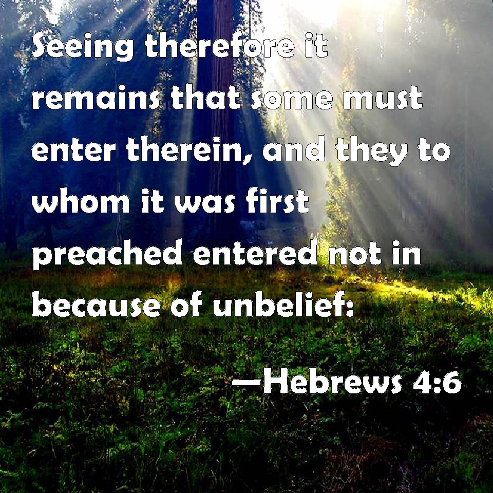 Choose a Background Hebrews 4:6 Seeing therefore it remains that some must enter therein, and they to whom it was first preached entered not in because of unbelief: KJV: Seeing therefore it remaineth that some must enter therein, and they to whom it was first preached entered not in because of unbelief: DRB: Seeing then it remaineth that some are to enter into it, and they, to whom it was first preached, did not enter because of unbelief: DBT: Seeing therefore it remains that some enter into it, and those who first received the glad tidings did not enter in on account of not hearkening to the word, ERV: Seeing therefore it remaineth that some should enter thereinto, and they to whom the good tidings were before preached failed to enter in because of disobedience, WBT: Seeing therefore it remaineth that some must enter into it, and they to whom it was first preached entered not because of unbelief: WEB: Seeing therefore it remains that some should enter therein, and they to whom the good news was before preached failed to enter in because of disobedience, YLT: since then, it remaineth for certain to enter into it, and those who did first hear good news entered not in because of unbelief — Links Hebrews 4:6 NIV • Hebrews 4:6 NLT • Hebrews 4:6 ESV • Hebrews 4:6 NASB • Hebrews 4:6 KJV • Hebrews 4:6 Interlinear • Hebrews 4:6 Commentaries • Hebrews 4:6 Parallel Texts • Hebrews 4:6 Bible Apps • Hebrews 4:6 Parallel • Bible Hub |