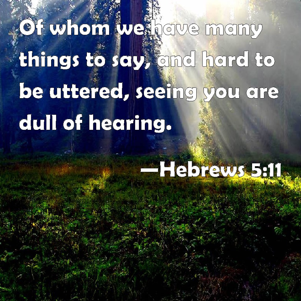 Choose a Background Hebrews 5:11 Of whom we have many things to say, and hard to be uttered, seeing you are dull of hearing. KJV: Of whom we have many things to say, and hard to be uttered, seeing ye are dull of hearing. DRB: Of whom we have much to say, and hard to be intelligibly uttered: because you are become weak to hear. DBT: Concerning whom we have much to say, and hard to be interpreted in speaking of it, since ye are become dull in hearing. ERV: Of whom we have many things to say, and hard of interpretation, seeing ye are become dull of hearing. WBT: Of whom we have many things to say, and hard to be uttered, seeing ye are dull of hearing. WEB: About him we have many words to say, and hard to interpret, seeing you have become dull of hearing. YLT: concerning whom we have much discourse and of hard explanation to say, since ye have become dull of hearing,Links Hebrews 5:11 NIV • Hebrews 5:11 NLT • Hebrews 5:11 ESV • Hebrews 5:11 NASB • Hebrews 5:11 KJV • Hebrews 5:11 Interlinear • Hebrews 5:11 Commentaries • Hebrews 5:11 Parallel Texts • Hebrews 5:11 Bible Apps • Hebrews 5:11 Parallel • Bible Hub |