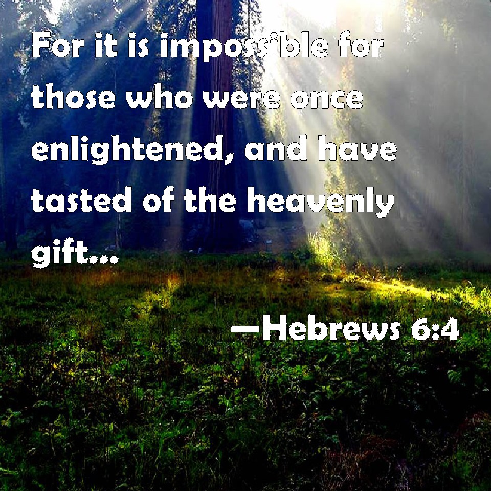 Choose a Background Hebrews 6:4 For it is impossible for those who were once enlightened, and have tasted of the heavenly gift, and were made partakers of the Holy Ghost, KJV: For it is impossible for those who were once enlightened, and have tasted of the heavenly gift, and were made partakers of the Holy Ghost, DRB: For it is impossible for those who were once illuminated, have tasted also the heavenly gift, and were made partakers of the Holy Ghost, DBT: For it is impossible to renew again to repentance those once enlightened, and who have tasted of the heavenly gift, and have been made partakers of the Holy Spirit, ERV: For as touching those who were once enlightened and tasted of the heavenly gift, and were made partakers of the Holy Ghost, WBT: For it is impossible for those who have been once enlightened, and have tasted the heavenly gift, and have been made partakers of the Holy Spirit. WEB: For concerning those who were once enlightened and tasted of the heavenly gift, and were made partakers of the Holy Spirit, YLT: for it is impossible for those once enlightened, having tasted also of the heavenly gift, and partakers having became of the Holy Spirit,Links Hebrews 6:4 NIV • Hebrews 6:4 NLT • Hebrews 6:4 ESV • Hebrews 6:4 NASB • Hebrews 6:4 KJV • Hebrews 6:4 Interlinear • Hebrews 6:4 Commentaries • Hebrews 6:4 Parallel Texts • Hebrews 6:4 Bible Apps • Hebrews 6:4 Parallel • Bible Hub |