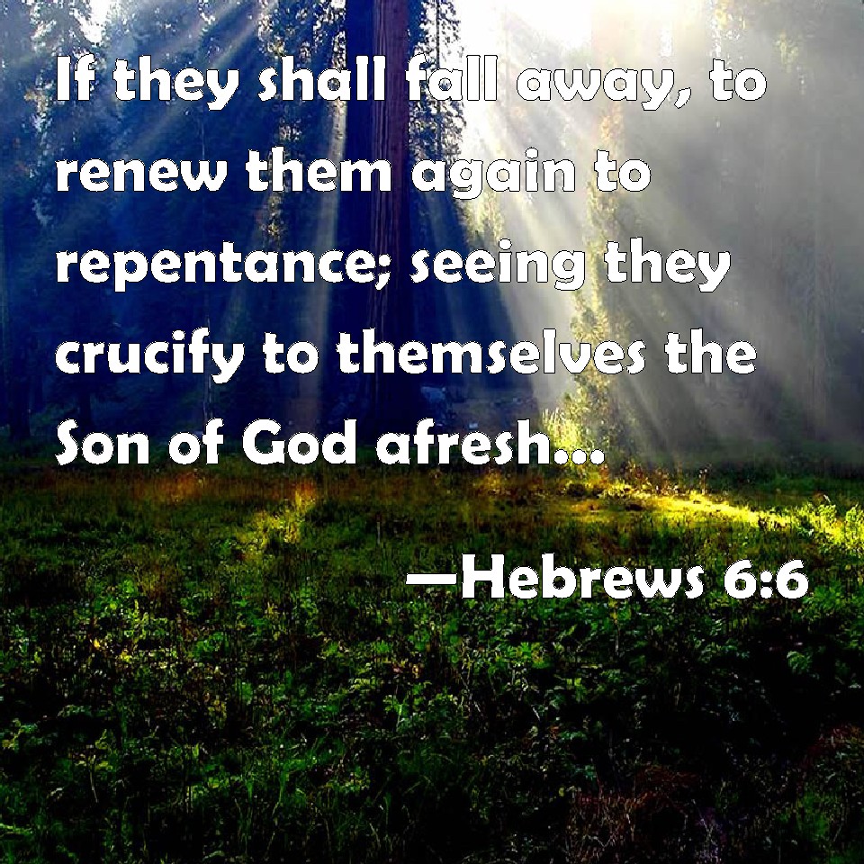 Choose a Background Hebrews 6:6 If they shall fall away, to renew them again to repentance; seeing they crucify to themselves the Son of God afresh, and put him to an open shame. KJV: If they shall fall away, to renew them again unto repentance; seeing they crucify to themselves the Son of God afresh, and put him to an open shame. DRB: And are fallen away: to be renewed again to penance, crucifying again to themselves the Son of God, and making him a mockery. DBT: and have fallen away, crucifying for themselves as they do the Son of God, and making a show of him. ERV: and then fell away, it is impossible to renew them again unto repentance; seeing they crucify to themselves the Son of God afresh, and put him to an open shame. WBT: If they shall fall away, to renew them again to repentance; seeing they crucify to themselves the Son of God afresh, and put him to an open shame. WEB: and then fell away, it is impossible to renew them again to repentance; seeing they crucify the Son of God for themselves again, and put him to open shame. YLT: and having fallen away, again to renew them to reformation, having crucified again to themselves the Son of God, and exposed to public shame.Links Hebrews 6:6 NIV • Hebrews 6:6 NLT • Hebrews 6:6 ESV • Hebrews 6:6 NASB • Hebrews 6:6 KJV • Hebrews 6:6 Interlinear • Hebrews 6:6 Commentaries • Hebrews 6:6 Parallel Texts • Hebrews 6:6 Bible Apps • Hebrews 6:6 Parallel • Bible Hub |