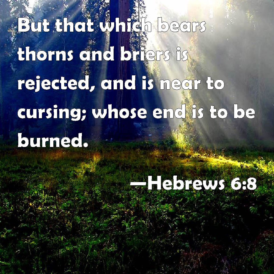 Choose a Background Hebrews 6:8 But that which bears thorns and briers is rejected, and is near to cursing; whose end is to be burned. KJV: But that which beareth thorns and briers is rejected, and is nigh unto cursing; whose end is to be burned. DRB: But that which bringeth forth thorns and briers, is reprobate, and very near unto a curse, whose end is to be burnt. DBT: but bringing forth thorns and briars, it is found worthless and nigh to a curse, whose end is to be burned. ERV: but if it beareth thorns and thistles, it is rejected and nigh unto a curse; whose end is to be burned. WBT: But that which beareth thorns and briers is rejected, and is nigh to cursing; whose end is to be burned. WEB: but if it bears thorns and thistles, it is rejected and near being cursed, whose end is to be burned. YLT: and that which is bearing thorns and briers is disapproved of, and nigh to cursing, whose end is for burning;Links Hebrews 6:8 NIV • Hebrews 6:8 NLT • Hebrews 6:8 ESV • Hebrews 6:8 NASB • Hebrews 6:8 KJV • Hebrews 6:8 Interlinear • Hebrews 6:8 Commentaries • Hebrews 6:8 Parallel Texts • Hebrews 6:8 Bible Apps • Hebrews 6:8 Parallel • Bible Hub |