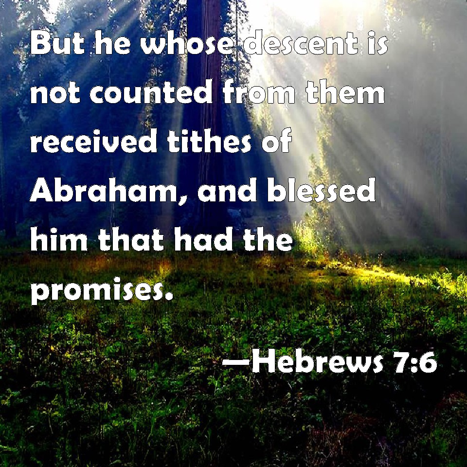 Choose a Background Hebrews 7:6 But he whose descent is not counted from them received tithes of Abraham, and blessed him that had the promises. KJV: But he whose descent is not counted from them received tithes of Abraham, and blessed him that had the promises. DRB: But he, whose pedigree is not numbered among them, received tithes of Abraham, and blessed him that had the promises. DBT: but he who has no genealogy from them has tithed Abraham, and blessed him who had the promises. ERV: but he whose genealogy is not counted from them hath taken tithes of Abraham, and hath blessed him that hath the promises. WBT: But he whose descent is not counted from them received tithes from Abraham, and blessed him that had the promises. WEB: but he whose genealogy is not counted from them has accepted tithes from Abraham, and has blessed him who has the promises. YLT: and he who was not reckoned by genealogy of them, received tithes from Abraham, and him having the promises he hath blessed,Links Hebrews 7:6 NIV • Hebrews 7:6 NLT • Hebrews 7:6 ESV • Hebrews 7:6 NASB • Hebrews 7:6 KJV • Hebrews 7:6 Interlinear • Hebrews 7:6 Commentaries • Hebrews 7:6 Parallel Texts • Hebrews 7:6 Bible Apps • Hebrews 7:6 Parallel • Bible Hub |