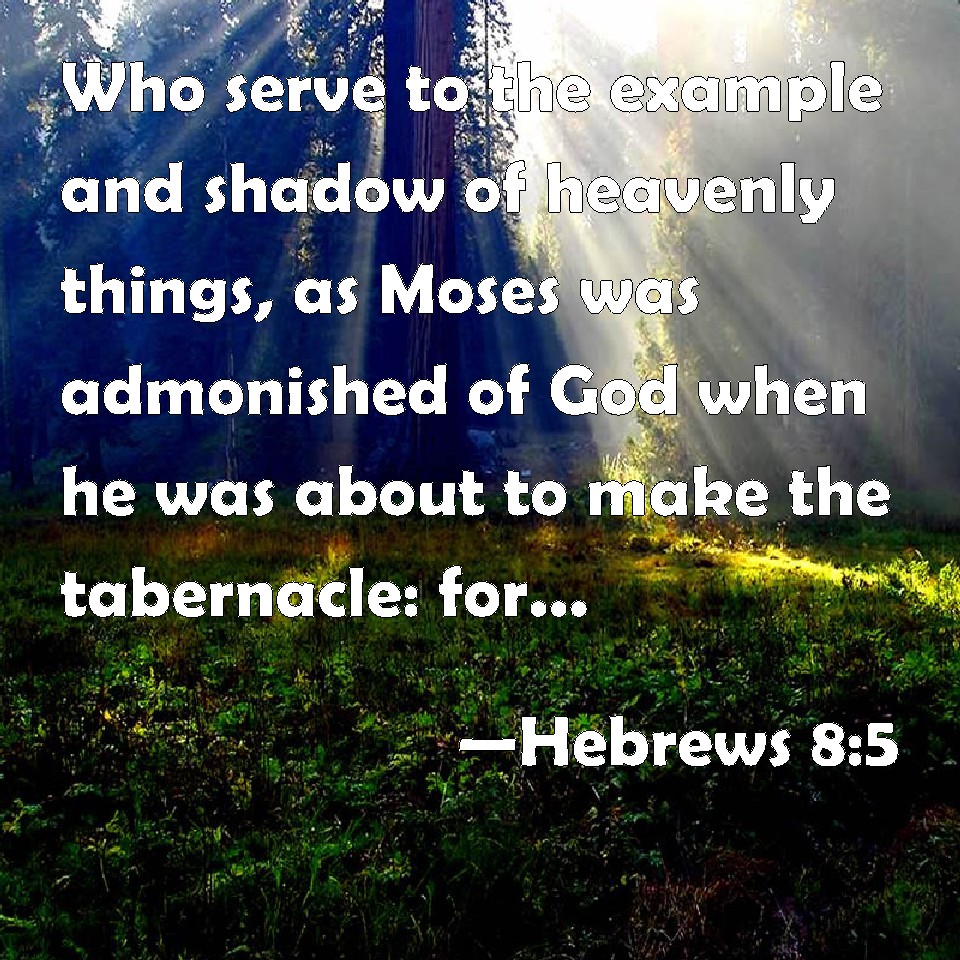 Choose a Background Hebrews 8:5 Who serve to the example and shadow of heavenly things, as Moses was admonished of God when he was about to make the tabernacle: for, See, said he, that you make all things according to the pattern showed to you in the mount. KJV: Who serve unto the example and shadow of heavenly things, as Moses was admonished of God when he was about to make the tabernacle: for, See, saith he, that thou make all things according to the pattern shewed to thee in the mount. DRB: Who serve unto the example and shadow of heavenly things. As it was answered to Moses, when he was to finish the tabernacle: See (saith he) that thou make all things according to the pattern which was shewn thee on the mount. DBT: (who serve the representation and shadow of heavenly things, according as Moses was oracularly told when about to make the tabernacle; for See, saith He, that thou make all things according to the pattern which has been shewn to thee in the mountain.) ERV: who serve that which is a copy and shadow of the heavenly things, even as Moses is warned of God when he is about to make the tabernacle: for, See, saith he, that thou make all things according to the pattern that was shewed thee in the mount. WBT: Who serve to the example and shadow of heavenly things, as Moses was admonished by God when he was about to make the tabernacle: for, See (saith he) that thou make all things according to the pattern shown to thee in the mount. WEB: who serve a copy and shadow of the heavenly things, even as Moses was warned by God when he was about to make the tabernacle, for he said, "See, you shall make everything according to the pattern that was shown to you on the mountain." YLT: who unto an example and shadow do serve of the heavenly things, as Moses hath been divinely warned, being about to construct the tabernacle, for 'See (saith He) thou mayest make all things according to the pattern that was shewn to thee in the mount;') — Links Hebrews 8:5 NIV • Hebrews 8:5 NLT • Hebrews 8:5 ESV • Hebrews 8:5 NASB • Hebrews 8:5 KJV • Hebrews 8:5 Interlinear • Hebrews 8:5 Commentaries • Hebrews 8:5 Parallel Texts • Hebrews 8:5 Bible Apps • Hebrews 8:5 Parallel • Bible Hub |