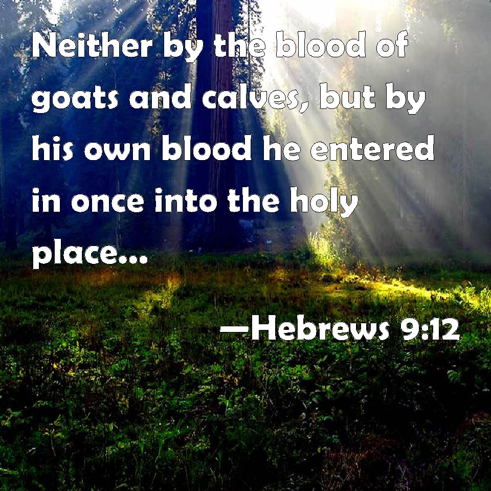 Choose a Background Hebrews 9:12 Neither by the blood of goats and calves, but by his own blood he entered in once into the holy place, having obtained eternal redemption for us. KJV: Neither by the blood of goats and calves, but by his own blood he entered in once into the holy place, having obtained eternal redemption for us. DRB: Neither by the blood of goats, or of calves, but by his own blood, entered once into the holies, having obtained eternal redemption. DBT: nor by blood of goats and calves, but by his own blood, has entered in once for all into the holy of holies, having found an eternal redemption. ERV: nor yet through the blood of goats and calves, but through his own blood, entered in once for all into the holy place, having obtained eternal redemption. WBT: Neither by the blood of goats and calves, but by his own blood; he entered in once into the holy place, having obtained eternal redemption for us. WEB: nor yet through the blood of goats and calves, but through his own blood, entered in once for all into the Holy Place, having obtained eternal redemption. YLT: neither through blood of goats and calves, but through his own blood, did enter in once into the holy places, age-during redemption having obtained;Links Hebrews 9:12 NIV • Hebrews 9:12 NLT • Hebrews 9:12 ESV • Hebrews 9:12 NASB • Hebrews 9:12 KJV • Hebrews 9:12 Interlinear • Hebrews 9:12 Commentaries • Hebrews 9:12 Parallel Texts • Hebrews 9:12 Bible Apps • Hebrews 9:12 Parallel • Bible Hub |