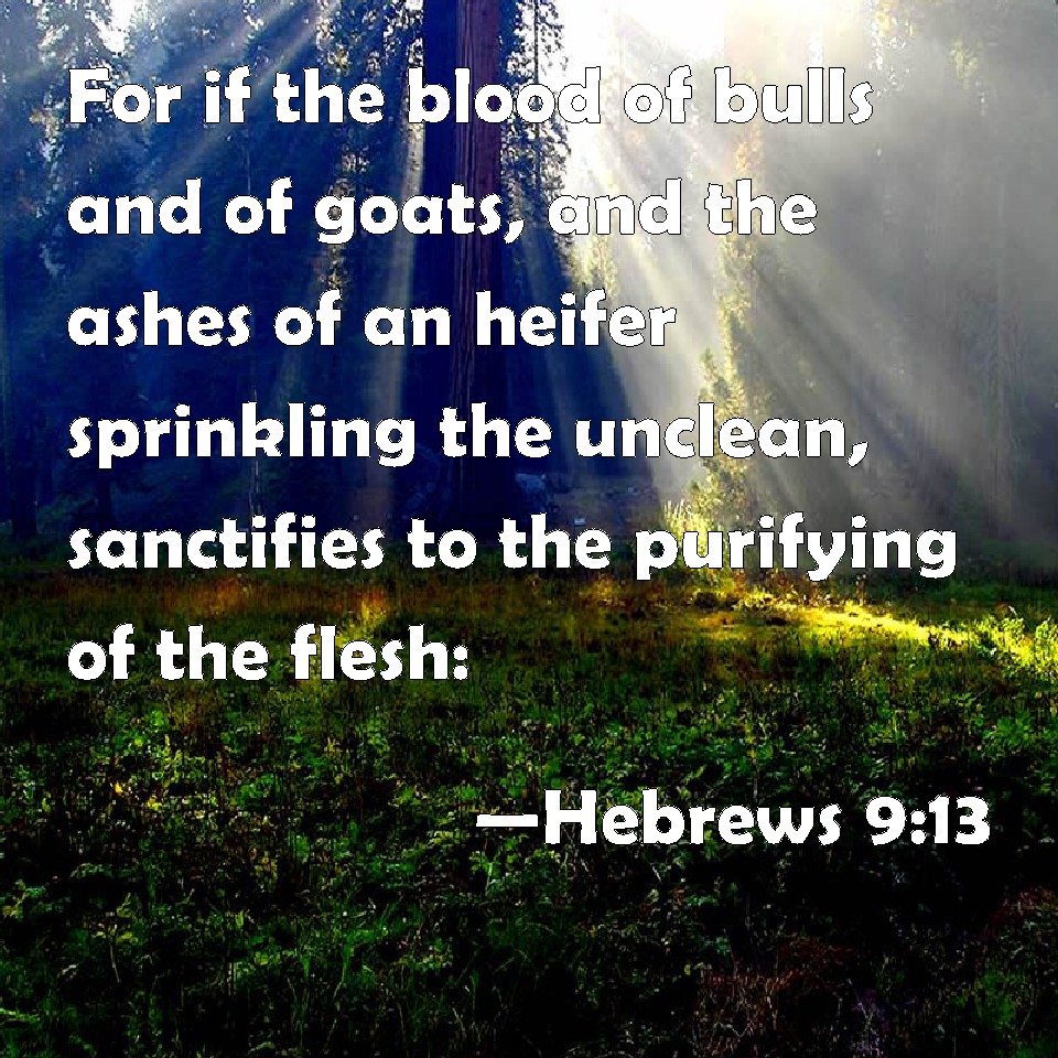Choose a Background Hebrews 9:13 For if the blood of bulls and of goats, and the ashes of an heifer sprinkling the unclean, sanctifies to the purifying of the flesh: KJV: For if the blood of bulls and of goats, and the ashes of an heifer sprinkling the unclean, sanctifieth to the purifying of the flesh: DRB: For if the blood of goats and of oxen, and the ashes of an heifer being sprinkled, sanctify such as are defiled, to the cleansing of the flesh: DBT: For if the blood of goats and bulls, and a heifer's ashes sprinkling the defiled, sanctifies for the purity of the flesh, ERV: For if the blood of goats and bulls, and the ashes of a heifer sprinkling them that have been defiled, sanctify unto the cleanness of the flesh: WBT: For if the blood of bulls and of goats, and the ashes of a heifer sprinkling the unclean, sanctify to the purifying of the flesh: WEB: For if the blood of goats and bulls, and the ashes of a heifer sprinkling those who have been defiled, sanctify to the cleanness of the flesh: YLT: for if the blood of bulls, and goats, and ashes of an heifer, sprinkling those defiled, doth sanctify to the purifying of the flesh,Links Hebrews 9:13 NIV • Hebrews 9:13 NLT • Hebrews 9:13 ESV • Hebrews 9:13 NASB • Hebrews 9:13 KJV • Hebrews 9:13 Interlinear • Hebrews 9:13 Commentaries • Hebrews 9:13 Parallel Texts • Hebrews 9:13 Bible Apps • Hebrews 9:13 Parallel • Bible Hub |