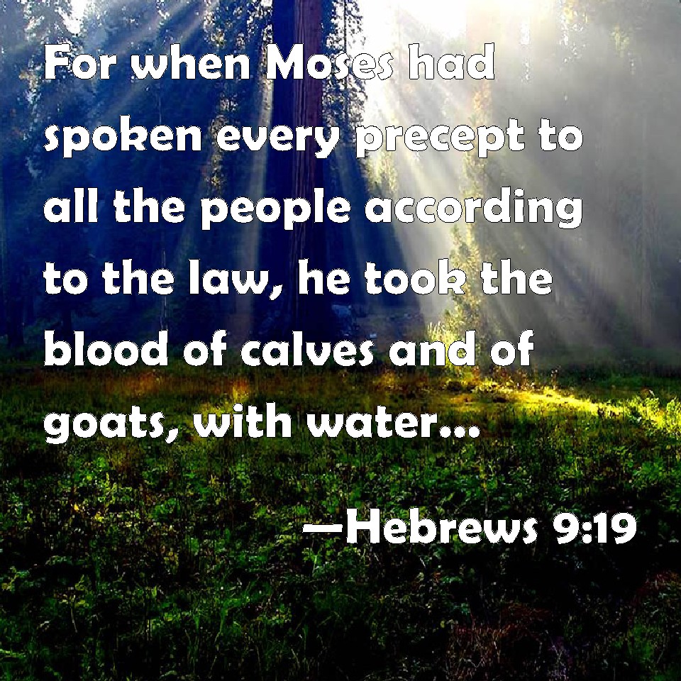 Choose a Background Hebrews 9:19 For when Moses had spoken every precept to all the people according to the law, he took the blood of calves and of goats, with water, and scarlet wool, and hyssop, and sprinkled both the book, and all the people, KJV: For when Moses had spoken every precept to all the people according to the law, he took the blood of calves and of goats, with water, and scarlet wool, and hyssop, and sprinkled both the book, and all the people, DRB: For when every commandment of the law had been read by Moses to all the people, he took the blood of calves and goats, with water, and scarlet wool and hyssop, and sprinkled both the book itself and all the people, DBT: For every commandment having been spoken according to the law by Moses to all the people; having taken the blood of calves and goats, with water and scarlet wool and hyssop, he sprinkled both the book itself and all the people, ERV: For when every commandment had been spoken by Moses unto all the people according to the law, he took the blood of the calves and the goats, with water and scarlet wool and hyssop, and sprinkled both the book itself, and all the people, WBT: For when Moses had spoken every precept to all the people according to the law, he took the blood of calves and of goats, with water, and scarlet wool, and hyssop, and sprinkled both the book and all the people, WEB: For when every commandment had been spoken by Moses to all the people according to the law, he took the blood of the calves and the goats, with water and scarlet wool and hyssop, and sprinkled both the book itself and all the people, YLT: for every command having been spoken, according to law, by Moses, to all the people, having taken the blood of the calves and goats, with water, and scarlet wool, and hyssop, he both the book itself and all the people did sprinkle,Links Hebrews 9:19 NIV • Hebrews 9:19 NLT • Hebrews 9:19 ESV • Hebrews 9:19 NASB • Hebrews 9:19 KJV • Hebrews 9:19 Interlinear • Hebrews 9:19 Commentaries • Hebrews 9:19 Parallel Texts • Hebrews 9:19 Bible Apps • Hebrews 9:19 Parallel • Bible Hub |