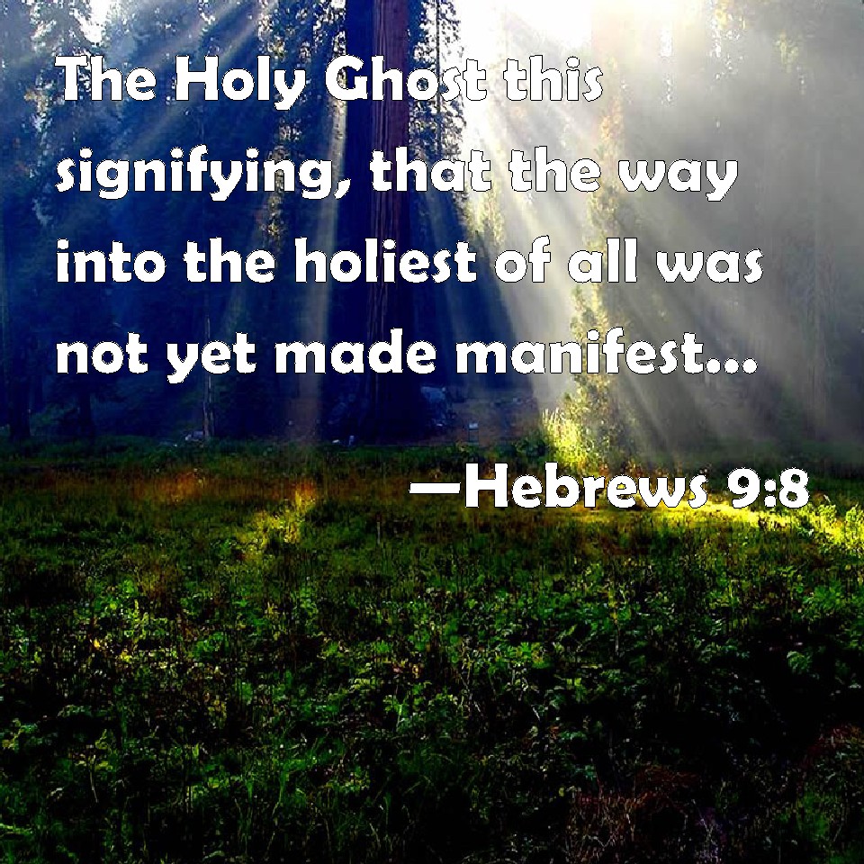 Choose a Background Hebrews 9:8 The Holy Ghost this signifying, that the way into the holiest of all was not yet made manifest, while as the first tabernacle was yet standing: KJV: The Holy Ghost this signifying, that the way into the holiest of all was not yet made manifest, while as the first tabernacle was yet standing: DRB: The Holy Ghost signifying this, that the way into the holies was not yet made manifest, whilst the former tabernacle was yet standing. DBT: the Holy Spirit shewing this, that the way of the holy of holies has not yet been made manifest while as yet the first tabernacle has its standing; ERV: the Holy Ghost this signifying, that the way into the holy place hath not yet been made manifest, while as the first tabernacle is yet standing; WBT: The Holy Spirit this signifying, that the way into the holiest of all was not yet made manifest, while the first tabernacle was yet standing: WEB: The Holy Spirit is indicating this, that the way into the Holy Place wasn't yet revealed while the first tabernacle was still standing; YLT: the Holy Spirit this evidencing that not yet hath been manifested the way of the holy places, the first tabernacle having yet a standing;Links Hebrews 9:8 NIV • Hebrews 9:8 NLT • Hebrews 9:8 ESV • Hebrews 9:8 NASB • Hebrews 9:8 KJV • Hebrews 9:8 Interlinear • Hebrews 9:8 Commentaries • Hebrews 9:8 Parallel Texts • Hebrews 9:8 Bible Apps • Hebrews 9:8 Parallel • Bible Hub |