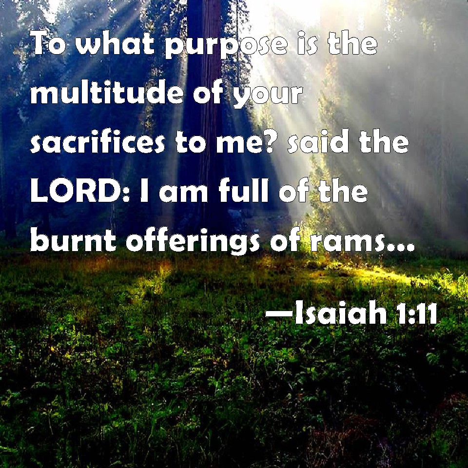 Choose a Background Isaiah 1:11 To what purpose is the multitude of your sacrifices to me? said the LORD: I am full of the burnt offerings of rams, and the fat of fed beasts; and I delight not in the blood of bullocks, or of lambs, or of he goats. KJV: To what purpose is the multitude of your sacrifices unto me? saith the LORD: I am full of the burnt offerings of rams, and the fat of fed beasts; and I delight not in the blood of bullocks, or of lambs, or of he goats. DRB: To what purpose do you offer me the multitude of your victims, saith the Lord? I am full, I desire not holocausts of rams, and fat of fatlings, and blood of calves, and lambs, and buck goats. DBT: To what purpose is the multitude of your sacrifices unto me? saith Jehovah. I am sated with burnt-offerings of rams, and the fat of fed beasts; and in the blood of bullocks, and of lambs, and of he-goats I take no pleasure. ERV: To what purpose is the multitude of your sacrifices unto me? saith the LORD: I am full of the burnt offerings of rams, and the fat of fed beasts; and I delight not in the blood of bullocks, or of lambs, or of he-goats. WBT: To what purpose is the multitude of your sacrifices to me? saith the LORD: I am full of the burnt-offerings of rams, and the fat of fed beasts; and I delight not in the blood of bullocks, or of lambs, or of he-goats. WEB: "What are the multitude of your sacrifices to me?," says Yahweh. "I have had enough of the burnt offerings of rams, and the fat of fed animals. I don't delight in the blood of bulls, or of lambs, or of male goats. YLT: Why to Me the abundance of your sacrifices? saith Jehovah, I have been satiated with burnt-offerings of rams, And fat of fatlings; And blood of bullocks, and lambs, And he-goats I have not desired.Links Isaiah 1:11 NIV • Isaiah 1:11 NLT • Isaiah 1:11 ESV • Isaiah 1:11 NASB • Isaiah 1:11 KJV • Isaiah 1:11 Interlinear • Isaiah 1:11 Commentaries • Isaiah 1:11 Parallel Texts • Isaiah 1:11 Bible Apps • Isaiah 1:11 Parallel • Bible Hub |