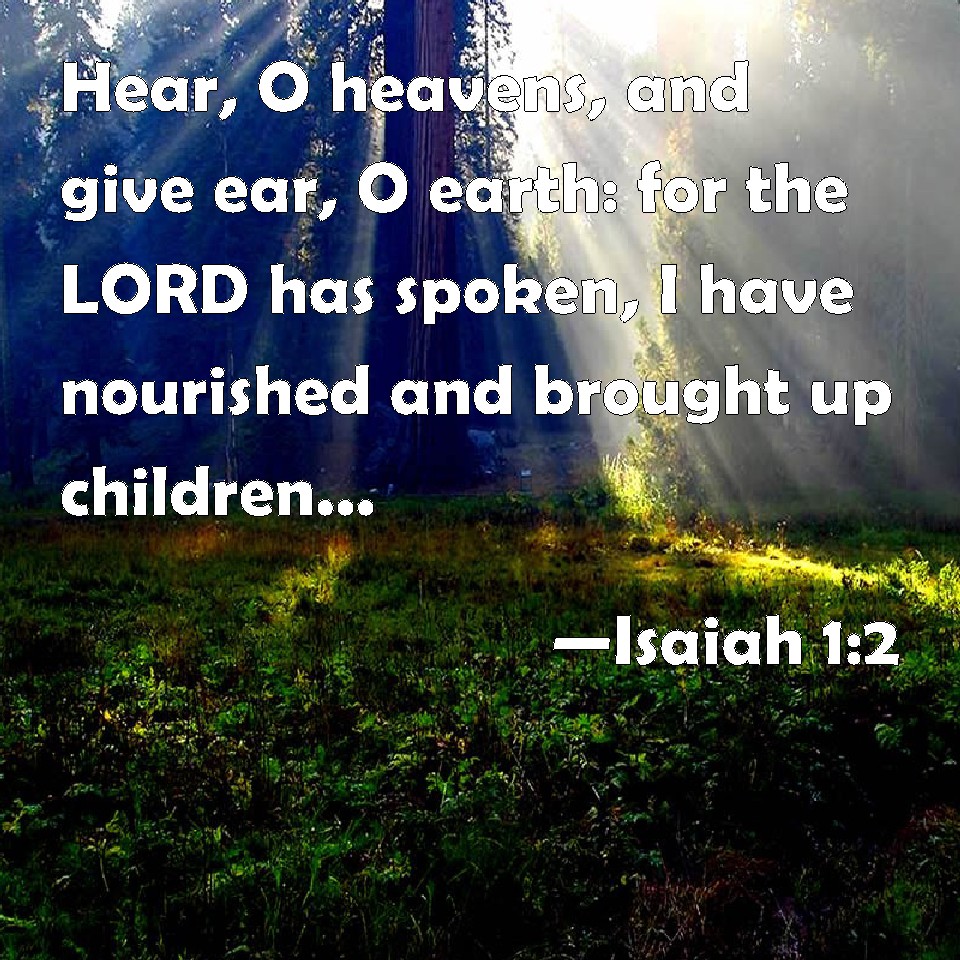 Choose a Background Isaiah 1:2 Hear, O heavens, and give ear, O earth: for the LORD has spoken, I have nourished and brought up children, and they have rebelled against me. KJV: Hear, O heavens, and give ear, O earth: for the LORD hath spoken, I have nourished and brought up children, and they have rebelled against me. DRB: Hear, O ye heavens, and give ear, O earth, for the Lord hath spoken. I have brought up children, and exalted them: but they have despised me. DBT: Hear, ye heavens, and give ear, thou earth! for Jehovah hath spoken: I have nourished and brought up children; and they have rebelled against me. ERV: Hear, O heavens, and give ear, O earth, for the LORD hath spoken: I have nourished and brought up children, and they have rebelled against me. WBT: Hear, O heavens, and give ear, O earth: for the LORD hath spoken, I have nourished and brought up children, and they have rebelled against me. WEB: Hear, heavens, and listen, earth; for Yahweh has spoken: "I have nourished and brought up children, and they have rebelled against me. YLT: Hear, O heavens, and give ear, O earth, For Jehovah hath spoken: Sons I have nourished and brought up, And they — they transgressed against Me.Links Isaiah 1:2 NIV • Isaiah 1:2 NLT • Isaiah 1:2 ESV • Isaiah 1:2 NASB • Isaiah 1:2 KJV • Isaiah 1:2 Interlinear • Isaiah 1:2 Commentaries • Isaiah 1:2 Parallel Texts • Isaiah 1:2 Bible Apps • Isaiah 1:2 Parallel • Bible Hub |