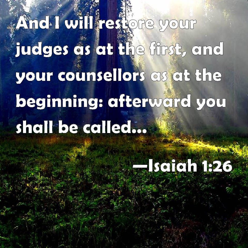 Choose a Background Isaiah 1:26 And I will restore your judges as at the first, and your counsellors as at the beginning: afterward you shall be called, The city of righteousness, the faithful city. KJV: And I will restore thy judges as at the first, and thy counsellers as at the beginning: afterward thou shalt be called, The city of righteousness, the faithful city. DRB: And I will restore thy judges se they were before, and thy counsellors as of old. After this thou shalt be called the city of the just, a faithful city. DBT: and I will restore thy judges as at the first, and thy counsellors as at the beginning. Afterwards thou shalt be called, Town of righteousness, Faithful city. ERV: and I will restore thy judges as at the first, and thy counsellors as at the beginning: afterward thou shalt be called The city of righteousness, the faithful city. WBT: And I will restore thy judges as at the first, and thy counselors as at the beginning: afterward thou shalt be called, The city of righteousness, the faithful city. WEB: I will restore your judges as at the first, and your counselors as at the beginning. Afterward you shall be called 'The city of righteousness, a faithful town.' YLT: And I give back thy judges as at the first, And thy counsellors as in the beginning, After this thou art called, 'A city of righteousness — a faithful city.'Links Isaiah 1:26 NIV • Isaiah 1:26 NLT • Isaiah 1:26 ESV • Isaiah 1:26 NASB • Isaiah 1:26 KJV • Isaiah 1:26 Interlinear • Isaiah 1:26 Commentaries • Isaiah 1:26 Parallel Texts • Isaiah 1:26 Bible Apps • Isaiah 1:26 Parallel • Bible Hub |