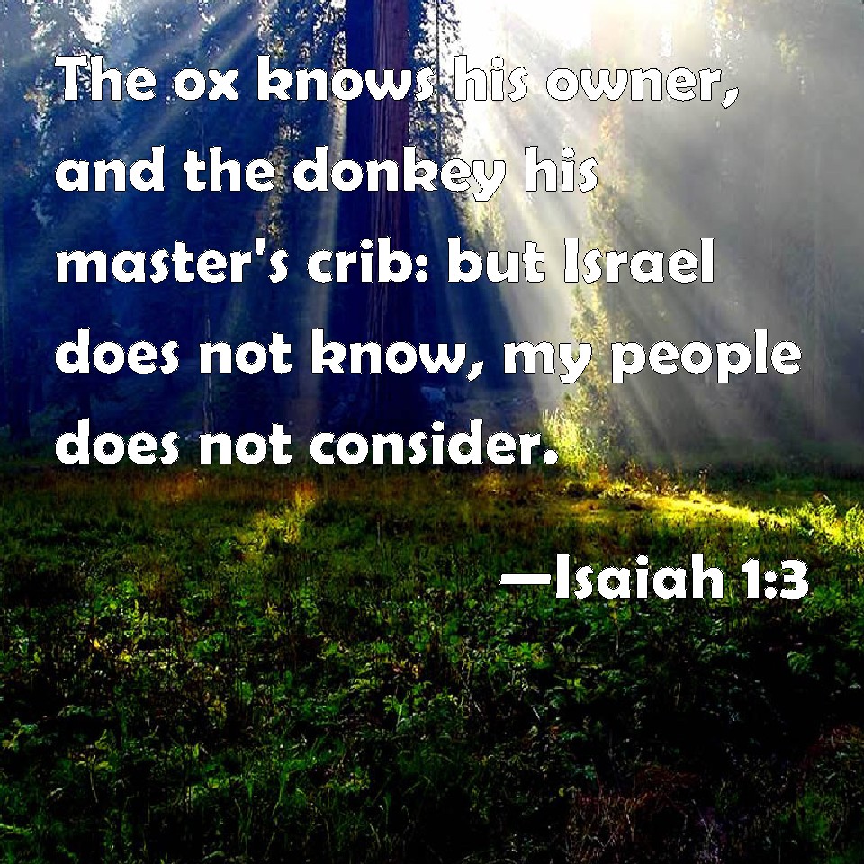 Choose a Background Isaiah 1:3 The ox knows his owner, and the ass his master's crib: but Israel does not know, my people does not consider. KJV: The ox knoweth his owner, and the ass his master's crib: but Israel doth not know, my people doth not consider. DRB: The ox knoweth his owner, and the ass his master's crib: but Israel hath not known me, and my people hath not understood. DBT: The ox knoweth his owner, and the ass his master's crib; Israel doth not know, my people hath no intelligence. ERV: The ox knoweth his owner, and the ass his master's crib: but Israel doth not know, my people doth not consider. WBT: The ox knoweth his owner, and the ass his master's crib: but Israel doth not know, my people doth not consider. WEB: The ox knows his owner, and the donkey his master's crib; but Israel doesn't know, my people don't consider." YLT: An ox hath known its owner, And an ass the crib of its master, Israel hath not known, My people hath not understood.Links Isaiah 1:3 NIV • Isaiah 1:3 NLT • Isaiah 1:3 ESV • Isaiah 1:3 NASB • Isaiah 1:3 KJV • Isaiah 1:3 Interlinear • Isaiah 1:3 Commentaries • Isaiah 1:3 Parallel Texts • Isaiah 1:3 Bible Apps • Isaiah 1:3 Parallel • Bible Hub |
