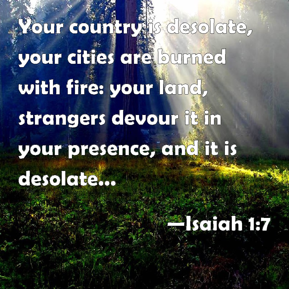 Choose a Background Isaiah 1:7 Your country is desolate, your cities are burned with fire: your land, strangers devour it in your presence, and it is desolate, as overthrown by strangers. KJV: Your country is desolate, your cities are burned with fire: your land, strangers devour it in your presence, and it is desolate, as overthrown by strangers. DRB: Your land is desolate, your cities are burnt with fire: your country strangers devour before your face, and it shall be desolate as when wasted by enemies. DBT: Your country is desolate; your cities are burned with fire; your land, strangers eat it up in your presence, and it is desolate, as overthrown by strangers. ERV: Your country is desolate; your cities are burned with fire; your land, strangers devour it in your presence, and it is desolate, as overthrown by strangers. WBT: Your country is desolate, your cities are burned with fire: your land, strangers devour it in your presence, and it is desolate, as overthrown by strangers. WEB: Your country is desolate. Your cities are burned with fire. Strangers devour your land in your presence, and it is desolate, as overthrown by strangers. YLT: Your land is a desolation, your cities burnt with fire, Your ground, before you strangers are consuming it, And a desolation as overthrown by strangers!Links Isaiah 1:7 NIV • Isaiah 1:7 NLT • Isaiah 1:7 ESV • Isaiah 1:7 NASB • Isaiah 1:7 KJV • Isaiah 1:7 Interlinear • Isaiah 1:7 Commentaries • Isaiah 1:7 Parallel Texts • Isaiah 1:7 Bible Apps • Isaiah 1:7 Parallel • Bible Hub |