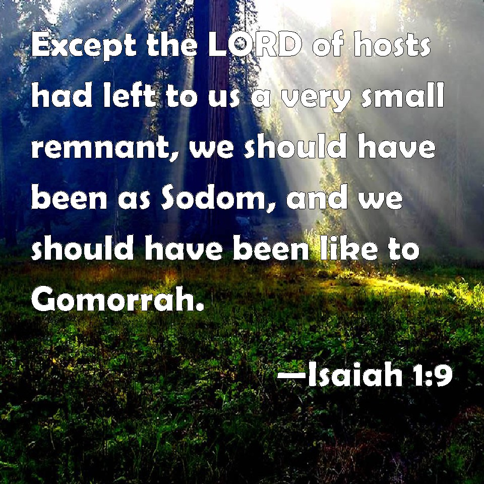 Choose a Background Isaiah 1:9 Except the LORD of hosts had left to us a very small remnant, we should have been as Sodom, and we should have been like to Gomorrah. KJV: Except the LORD of hosts had left unto us a very small remnant, we should have been as Sodom, and we should have been like unto Gomorrah. DRB: Except the Lord of hosts had left us seed, we had been as Sodom, and we should have been like to Gomorrha. DBT: Unless Jehovah of hosts had left us a very small residue, we should have been as Sodom, we should have been like unto Gomorrah. ERV: Except the LORD of hosts had left unto us a very small remnant, we should have been as Sodom, we should have been like unto Gomorrah. WBT: Except the LORD of hosts had left to us a very small remnant, we should have been as Sodom; we should have been like Gomorrah. WEB: Unless Yahweh of Armies had left to us a very small remnant, we would have been as Sodom; we would have been like Gomorrah. YLT: Unless Jehovah of Hosts had left to us a remnant, Shortly — as Sodom we had been, To Gomorrah we had been like!Links Isaiah 1:9 NIV • Isaiah 1:9 NLT • Isaiah 1:9 ESV • Isaiah 1:9 NASB • Isaiah 1:9 KJV • Isaiah 1:9 Interlinear • Isaiah 1:9 Commentaries • Isaiah 1:9 Parallel Texts • Isaiah 1:9 Bible Apps • Isaiah 1:9 Parallel • Bible Hub |