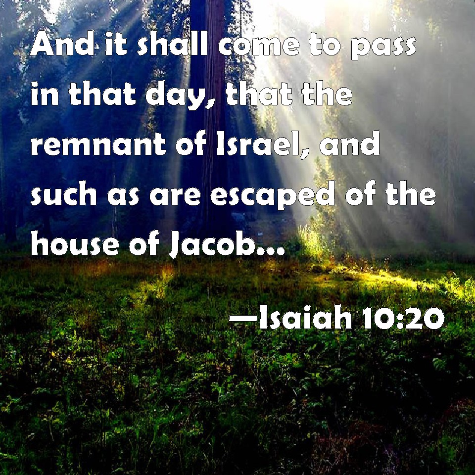 Choose a Background Isaiah 10:20 And it shall come to pass in that day, that the remnant of Israel, and such as are escaped of the house of Jacob, shall no more again stay on him that smote them; but shall stay on the LORD, the Holy One of Israel, in truth. KJV: And it shall come to pass in that day, that the remnant of Israel, and such as are escaped of the house of Jacob, shall no more again stay upon him that smote them; but shall stay upon the LORD, the Holy One of Israel, in truth. DRB: And it shall come to pass in that day, that the remnant of Israel, and they that shall escape of the house of Jacob, shall lean no more upon him that striketh them: but they shall lean upon the Lord the Holy One of Israel, in truth. DBT: And it shall come to pass in that day, that the remnant of Israel and such as are escaped of the house of Jacob shall no more again rely upon him that smote them; but they shall rely upon Jehovah, the Holy One of Israel, in truth. ERV: And it shall come to pass in that day, that the remnant of Israel, and they that are escaped of the house of Jacob, shall no more again stay upon him that smote them; but shall stay upon the LORD, the Holy One of Israel, in truth. WBT: And it shall come to pass in that day, that the remnant of Israel, and such as have escaped of the house of Jacob, shall no more again lean upon him that smote them; but shall lean upon the LORD, the Holy One of Israel, in truth. WEB: It will come to pass in that day that the remnant of Israel, and those who have escaped from the house of Jacob will no more again lean on him who struck them, but shall lean on Yahweh, the Holy One of Israel, in truth. YLT: And it hath come to pass, in that day, The remnant of Israel, And the escaped of the house of Jacob, Do not add any more to lean on its smiter, And have leant on Jehovah, The Holy One of Israel, in truth.Links Isaiah 10:20 NIV • Isaiah 10:20 NLT • Isaiah 10:20 ESV • Isaiah 10:20 NASB • Isaiah 10:20 KJV • Isaiah 10:20 Interlinear • Isaiah 10:20 Commentaries • Isaiah 10:20 Parallel Texts • Isaiah 10:20 Bible Apps • Isaiah 10:20 Parallel • Bible Hub |