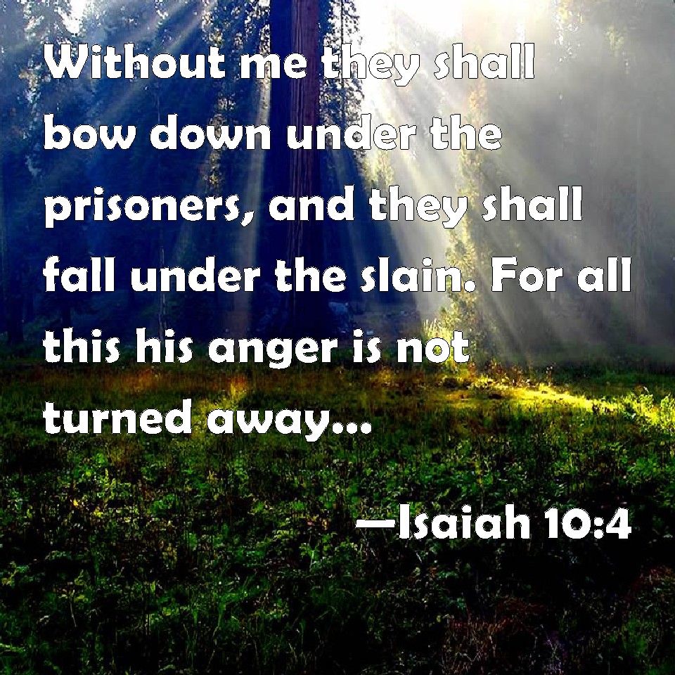 Choose a Background Isaiah 10:4 Without me they shall bow down under the prisoners, and they shall fall under the slain. For all this his anger is not turned away, but his hand is stretched out still. KJV: Without me they shall bow down under the prisoners, and they shall fall under the slain. For all this his anger is not turned away, but his hand is stretched out still. DRB: That you be not bowed down under the bond, and fall with the slain? In all these things his anger is not turned away, but his hand is stretched out still. DBT: They can but crouch under the prisoners, and they shall fall under the slain. For all this his anger is not turned away, and his hand is stretched out still. ERV: They shall only bow down under the prisoners, and shall fall under the slain. For all this his anger is not turned away, but his hand is stretched out still. WBT: Without me they shall bow down under the prisoners, and they shall fall under the slain. For all this his anger is not turned away, but his hand is stretched out still. WEB: They will only bow down under the prisoners, and will fall under the slain. For all this his anger is not turned away, but his hand is stretched out still. YLT: Without Me it hath bowed down In the place of a bound one, And in the place of the slain they fall. With all this not turned back hath His anger, And still His hand is stretched out.Links Isaiah 10:4 NIV • Isaiah 10:4 NLT • Isaiah 10:4 ESV • Isaiah 10:4 NASB • Isaiah 10:4 KJV • Isaiah 10:4 Interlinear • Isaiah 10:4 Commentaries • Isaiah 10:4 Parallel Texts • Isaiah 10:4 Bible Apps • Isaiah 10:4 Parallel • Bible Hub |