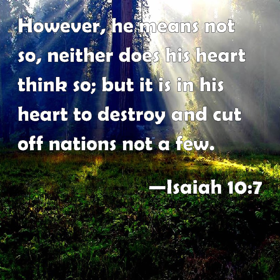 Choose a Background Isaiah 10:7 However, he means not so, neither does his heart think so; but it is in his heart to destroy and cut off nations not a few. KJV: Howbeit he meaneth not so, neither doth his heart think so; but it is in his heart to destroy and cut off nations not a few. DRB: But he shall not take it so, and his heart shall not think so: but his heart shall be set to destroy, and to cut off nations not a few. DBT: But he meaneth not so, neither doth his heart think so; for it is in his heart to extirpate and cut off nations not a few. ERV: Howbeit he meaneth not so, neither doth his heart think so; but it is in his heart to destroy, and to cut off nations not a few. WBT: Howbeit he meaneth not so, neither doth his heart think so; but it is in his heart to destroy and cut off nations not a few. WEB: However he doesn't mean so, neither does his heart think so; but it is in his heart to destroy, and to cut off not a few nations. YLT: And he — he thinketh not so, And his heart reckoneth not so, For — to destroy is in his heart, And to cut off nations not a few.Links Isaiah 10:7 NIV • Isaiah 10:7 NLT • Isaiah 10:7 ESV • Isaiah 10:7 NASB • Isaiah 10:7 KJV • Isaiah 10:7 Interlinear • Isaiah 10:7 Commentaries • Isaiah 10:7 Parallel Texts • Isaiah 10:7 Bible Apps • Isaiah 10:7 Parallel • Bible Hub |