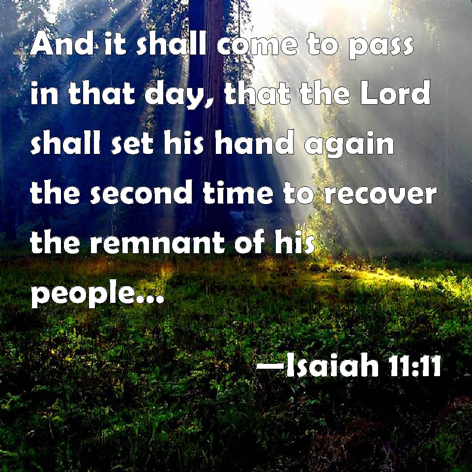 Choose a Background Isaiah 11:11 And it shall come to pass in that day, that the Lord shall set his hand again the second time to recover the remnant of his people, which shall be left, from Assyria, and from Egypt, and from Pathros, and from Cush, and from Elam, and from Shinar, and from Hamath, and from the islands of the sea. KJV: And it shall come to pass in that day, that the Lord shall set his hand again the second time to recover the remnant of his people, which shall be left, from Assyria, and from Egypt, and from Pathros, and from Cush, and from Elam, and from Shinar, and from Hamath, and from the islands of the sea. DRB: And it shall come to pass in that day, that the Lord shall set his hand the second time to possess the remnant of his people, which shall be left from the Assyrians, and from Egypt, and from Phetros, and from Ethiopia, and from Elam, and from Sennaar, and from Emath, and from the islands of the sea. DBT: And it shall come to pass in that day, that the Lord shall set his hand again the second time to acquire the remnant of his people which shall be left, from Assyria, and from Egypt, and from Pathros, and from Cush, and from Elam, and from Shinar, and from Hamath, and from the islands of the sea. ERV: And it shall come to pass in that day, that the Lord shall set his hand again the second time to recover the remnant of his people, which shall remain, from Assyria, and from Egypt, and from Pathros, and from Cush, and from Elam, and from Shinar, and from Hamath, and from the islands of the sea. WBT: And it shall come to pass in that day, that the Lord will set his hand again the second time to recover the remnant of his people, which shall be left, from Assyria, and from Egypt, and from Pathros, and from Cush, and from Elam, and from Shinar, and from Hamath, and from the isles of the sea. WEB: It will happen in that day that the Lord will set his hand again the second time to recover the remnant that is left of his people from Assyria, from Egypt, from Pathros, from Cush, from Elam, from Shinar, from Hamath, and from the islands of the sea. YLT: And it hath come to pass, in that day, The Lord addeth a second time his power, To get the remnant of His people that is left, From Asshur, and from Egypt, And from Pathros, and from Cush, And from Elam, and from Shinar, And from Hamath, and from isles of the sea,Links Isaiah 11:11 NIV • Isaiah 11:11 NLT • Isaiah 11:11 ESV • Isaiah 11:11 NASB • Isaiah 11:11 KJV • Isaiah 11:11 Interlinear • Isaiah 11:11 Commentaries • Isaiah 11:11 Parallel Texts • Isaiah 11:11 Bible Apps • Isaiah 11:11 Parallel • Bible Hub |