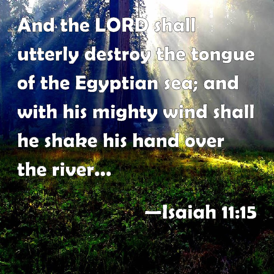 Choose a Background Isaiah 11:15 And the LORD shall utterly destroy the tongue of the Egyptian sea; and with his mighty wind shall he shake his hand over the river, and shall smite it in the seven streams, and make men go over with dry sandals. KJV: And the LORD shall utterly destroy the tongue of the Egyptian sea; and with his mighty wind shall he shake his hand over the river, and shall smite it in the seven streams, and make men go over dryshod. DRB: And the Lord shall lay waste the tongue of the sea of Egypt, and shall lift up his hand over the river in the strength of his spirit: and he shall strike it in the seven streams, so that men may pass through it in their shoes. DBT: And Jehovah will utterly destroy the tongue of the Egyptian sea; and with his mighty wind will he shake his hand over the river, and will smite it into seven streams, and make men go over dryshod. ERV: And the LORD shall utterly destroy the tongue of the Egyptian sea; and with his scorching wind shall he shake his hand over the River, and shall smite it into seven streams, and cause men to march over dryshod. WBT: And the LORD will utterly destroy the tongue of the Egyptian sea; and with his mighty wind will he shake his hand over the river, and will smite it in the seven streams, and make men go over dry shod. WEB: Yahweh will utterly destroy the tongue of the Egyptian sea; and with his scorching wind he will wave his hand over the River, and will split it into seven streams, and cause men to march over in sandals. YLT: And Jehovah hath devoted to destruction The tongue of the sea of Egypt, And hath waved His hand over the river, In the terror of his wind, And hath smitten it at the seven streams, And hath caused men to tread it with shoes.Links Isaiah 11:15 NIV • Isaiah 11:15 NLT • Isaiah 11:15 ESV • Isaiah 11:15 NASB • Isaiah 11:15 KJV • Isaiah 11:15 Interlinear • Isaiah 11:15 Commentaries • Isaiah 11:15 Parallel Texts • Isaiah 11:15 Bible Apps • Isaiah 11:15 Parallel • Bible Hub |