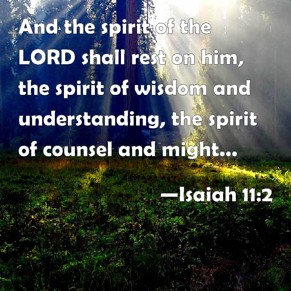 Choose a Background Isaiah 11:2 And the spirit of the LORD shall rest on him, the spirit of wisdom and understanding, the spirit of counsel and might, the spirit of knowledge and of the fear of the LORD; KJV: And the spirit of the LORD shall rest upon him, the spirit of wisdom and understanding, the spirit of counsel and might, the spirit of knowledge and of the fear of the LORD; DRB: And the spirit of the Lord shall rest upon him: the spirit of wisdom, and of understanding, the spirit of counsel, and of fortitude, the spirit of knowledge, and of godliness. DBT: and the Spirit of Jehovah shall rest upon him, the spirit of wisdom and understanding, the spirit of counsel and might, the spirit of knowledge and of the fear of Jehovah. ERV: And the spirit of the LORD shall rest upon him, the spirit of wisdom and understanding, the spirit of counsel and might, the spirit of knowledge and of the fear of the LORD; WBT: And the spirit of the LORD will rest upon him, the spirit of wisdom and understanding, the spirit of counsel and might, the spirit of knowledge and of the fear of the LORD; WEB: The Spirit of Yahweh will rest on him: the spirit of wisdom and understanding, the spirit of counsel and might, the spirit of knowledge and of the fear of Yahweh. YLT: Rested on him hath the Spirit of Jehovah, The spirit of wisdom and understanding, The spirit of counsel and might, The spirit of knowledge and fear of Jehovah.Links Isaiah 11:2 NIV • Isaiah 11:2 NLT • Isaiah 11:2 ESV • Isaiah 11:2 NASB • Isaiah 11:2 KJV • Isaiah 11:2 Interlinear • Isaiah 11:2 Commentaries • Isaiah 11:2 Parallel Texts • Isaiah 11:2 Bible Apps • Isaiah 11:2 Parallel • Bible Hub |