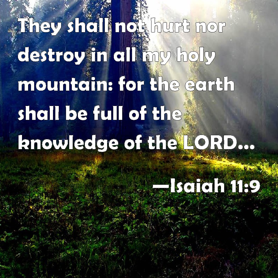 Choose a Background Isaiah 11:9 They shall not hurt nor destroy in all my holy mountain: for the earth shall be full of the knowledge of the LORD, as the waters cover the sea. KJV: They shall not hurt nor destroy in all my holy mountain: for the earth shall be full of the knowledge of the LORD, as the waters cover the sea. DRB: They shall not hurt, nor shall they kill in all my holy mountain, for the earth is filled with the knowledge of the Lord, as the covering waters of the sea. DBT: They shall not hurt nor destroy in all my holy mountain; for the earth shall be full of the knowledge of Jehovah, as the waters cover the sea. ERV: They shall not hurt nor destroy in all my holy mountain: for the earth shall be full of the knowledge of the LORD, as the waters cover the sea. WBT: They shall not hurt nor destroy in all my holy mountain: for the earth shall be full of the knowledge of the LORD, as the waters cover the sea. WEB: They will not hurt nor destroy in all my holy mountain; for the earth will be full of the knowledge of Yahweh, as the waters cover the sea. YLT: Evil they do not, nor destroy in all My holy mountain, For full hath been the earth with the knowledge of Jehovah, As the waters are covering the sea.Links Isaiah 11:9 NIV • Isaiah 11:9 NLT • Isaiah 11:9 ESV • Isaiah 11:9 NASB • Isaiah 11:9 KJV • Isaiah 11:9 Interlinear • Isaiah 11:9 Commentaries • Isaiah 11:9 Parallel Texts • Isaiah 11:9 Bible Apps • Isaiah 11:9 Parallel • Bible Hub |
