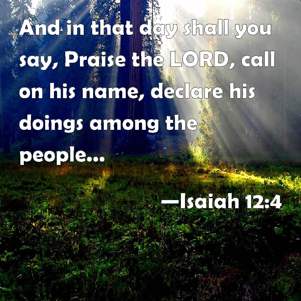 Choose a Background Isaiah 12:4 And in that day shall you say, Praise the LORD, call on his name, declare his doings among the people, make mention that his name is exalted. KJV: And in that day shall ye say, Praise the LORD, call upon his name, declare his doings among the people, make mention that his name is exalted. DRB: And you shall say in that day: Praise ye the Lord, and call upon his name: make his works known among the people: remember that his name is high. DBT: And in that day shall ye say, Give ye thanks to Jehovah, call upon his name, declare his deeds among the peoples, make mention that his name is exalted. ERV: And in that day shall ye say, Give thanks unto the LORD, call upon his name, declare his doings among the peoples, make mention that his name is exalted. WBT: And in that day shall ye say, Praise the LORD, call upon his name, declare his doings among the people, make mention that his name is exalted. WEB: In that day you will say, "Give thanks to Yahweh! Call on his name. Declare his doings among the peoples. Proclaim that his name is exalted! YLT: And ye have said in that day, Give ye praise to Jehovah, call in His name. Make known among the peoples His acts. Make mention that set on high is His name.Links Isaiah 12:4 NIV • Isaiah 12:4 NLT • Isaiah 12:4 ESV • Isaiah 12:4 NASB • Isaiah 12:4 KJV • Isaiah 12:4 Interlinear • Isaiah 12:4 Commentaries • Isaiah 12:4 Parallel Texts • Isaiah 12:4 Bible Apps • Isaiah 12:4 Parallel • Bible Hub |
